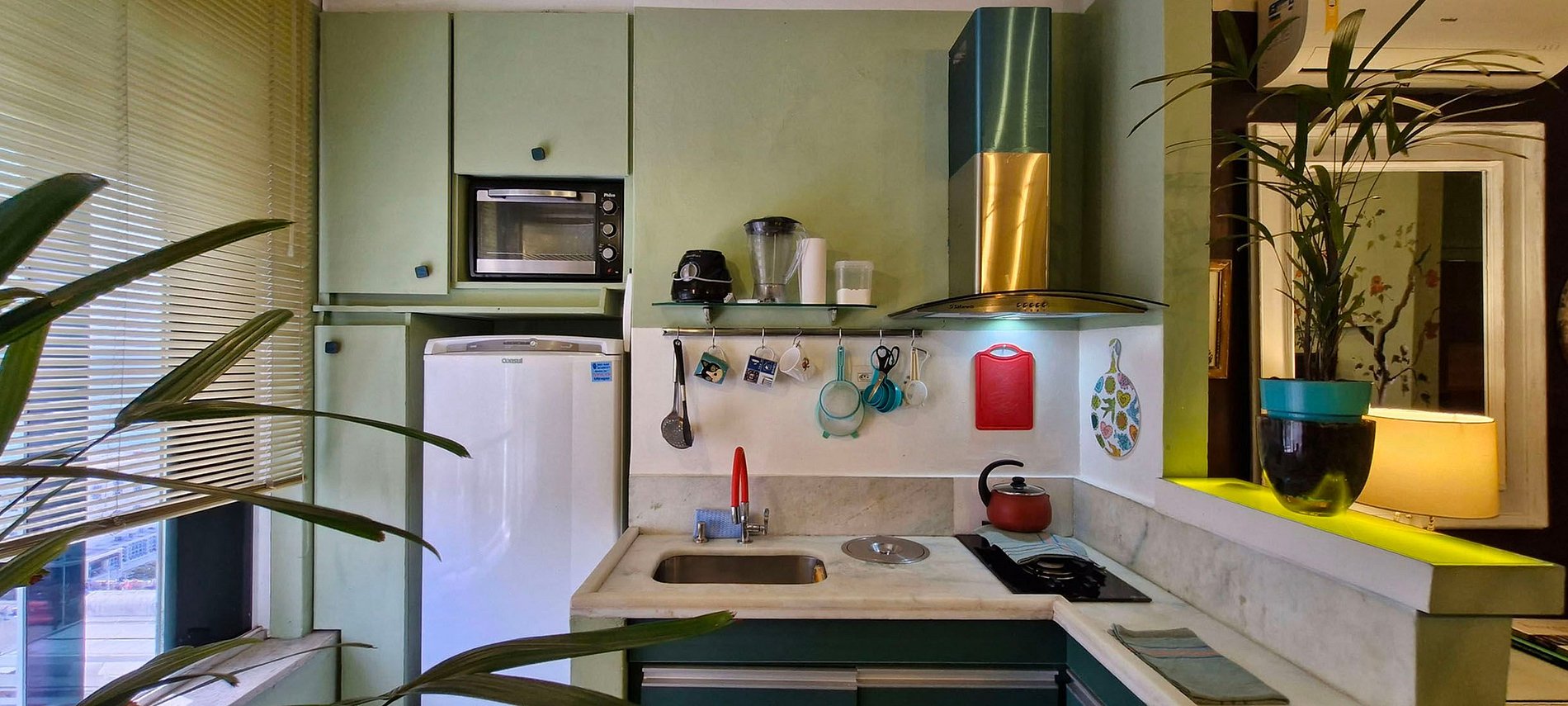 - COZINHA: geladeira, cooktop 2 bocas, depurador de ar, torradeira, cafeteira elétrica, forno elétrico pequeno, liquidificador e acessórios de cozinha variados.