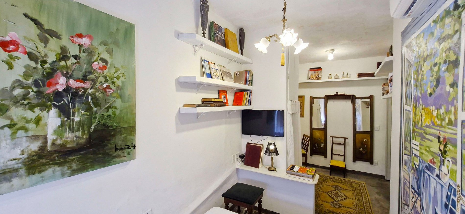 - SALA DE ESTAR: sofá, poltrona, ar condicionado split, ventilador portátil, smart TV, WI-FI, mesa com abajur, espelho