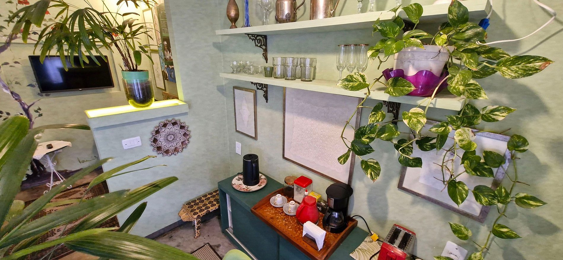- SALA DE ESTAR: sofá, poltrona, ar condicionado split, ventilador portátil, smart TV, WI-FI, mesa com abajur, espelho