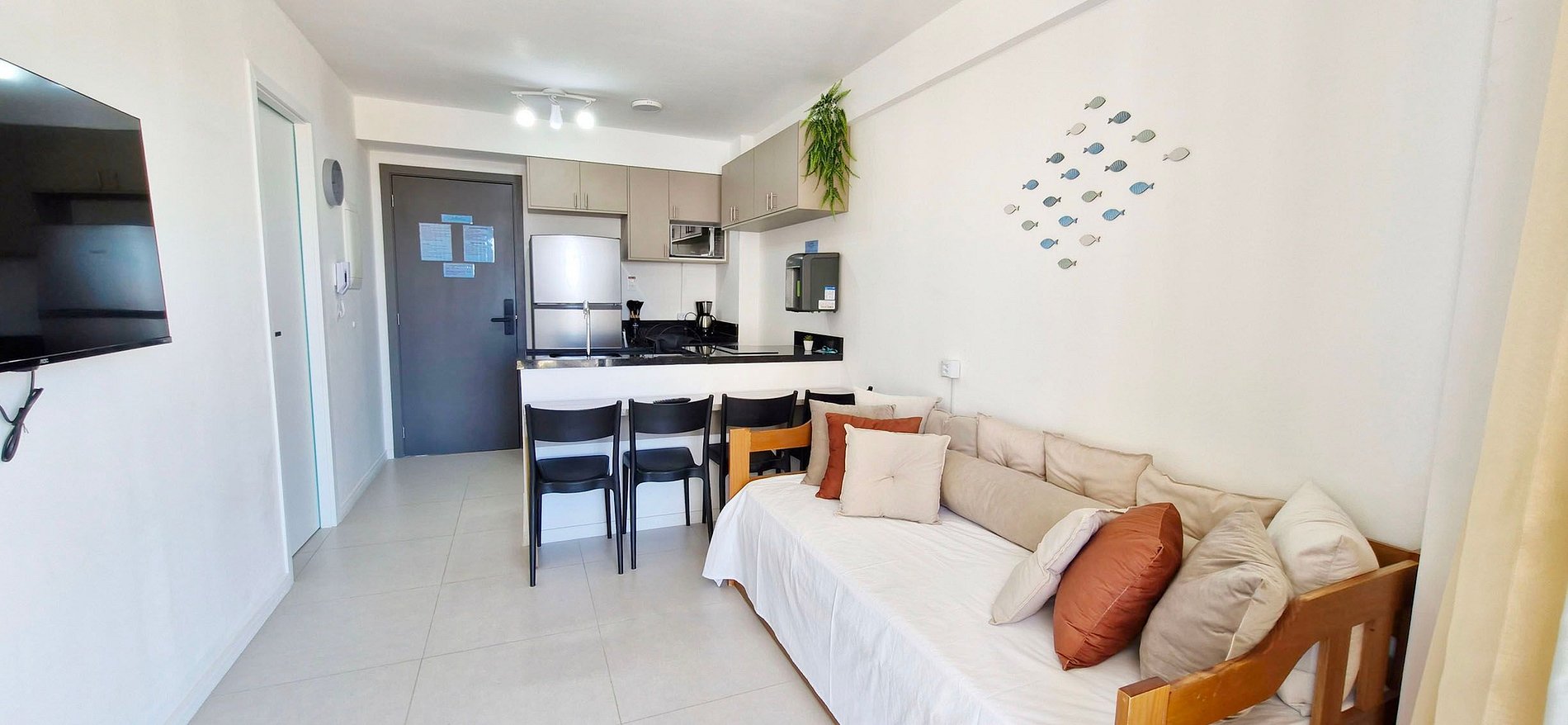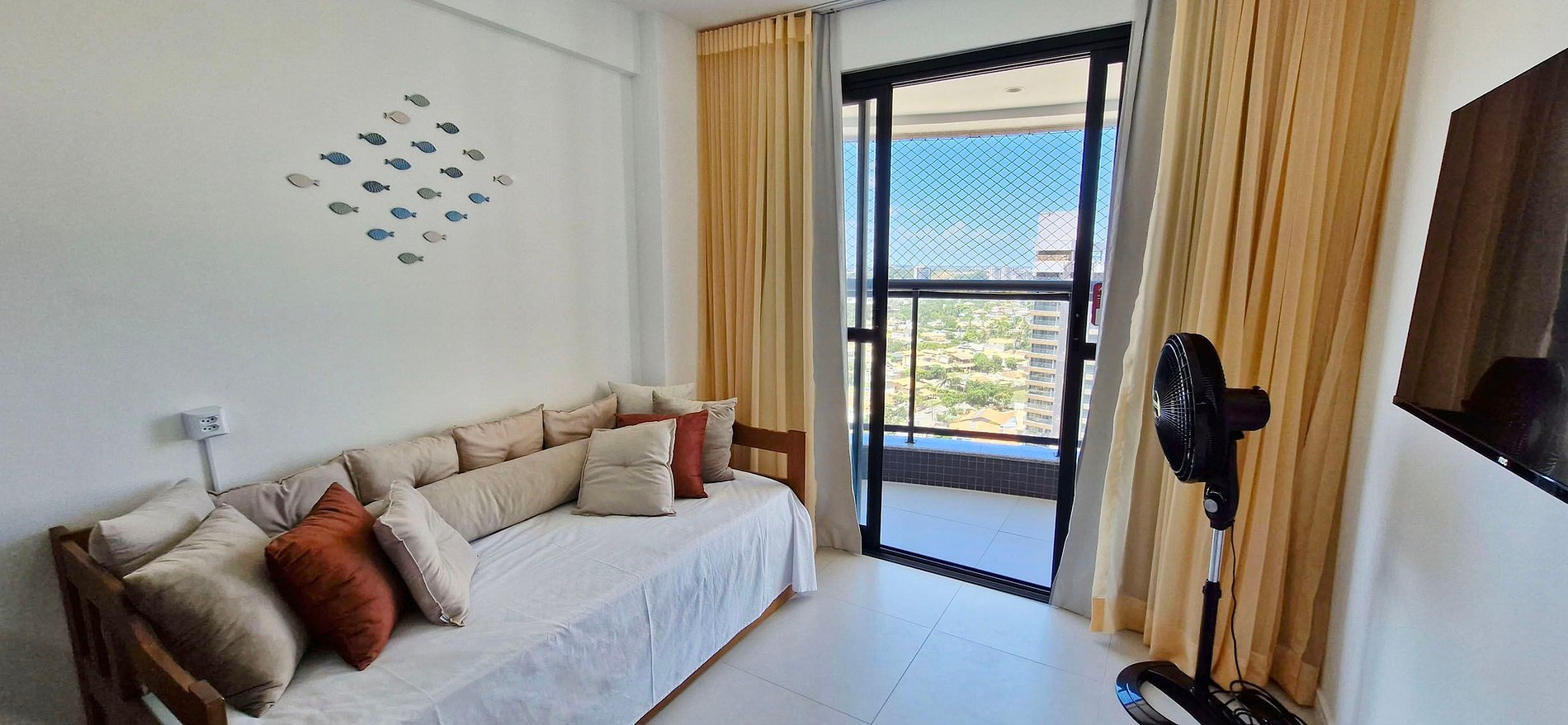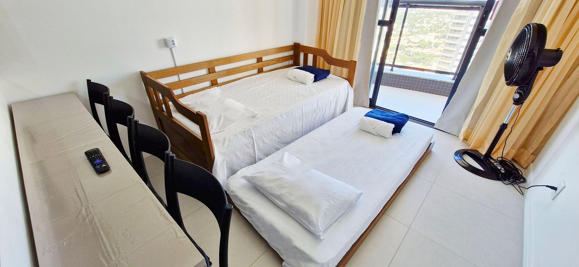 - SALA DE ESTAR: bicama solteiro, smart TV, ventilador de pé, cortina blackout