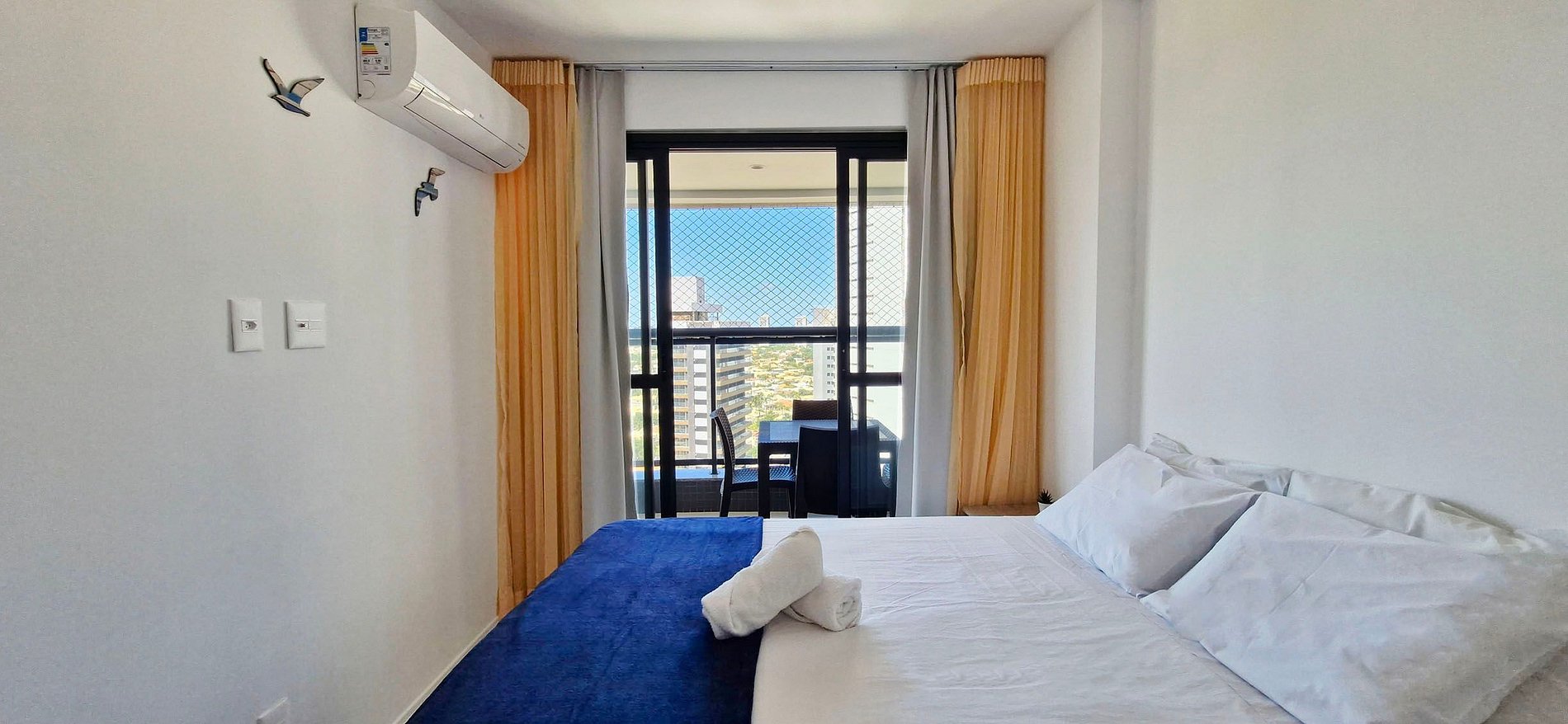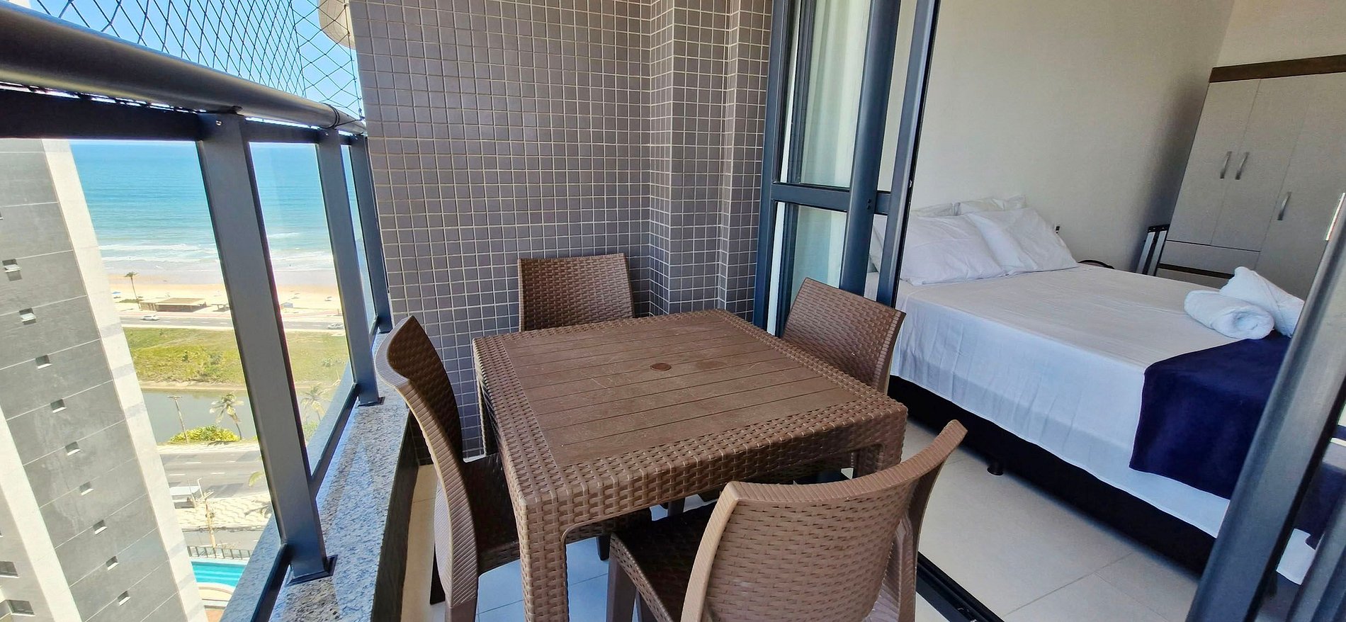 Quarto e sala com varanda vista mar incrível no Beach Class!