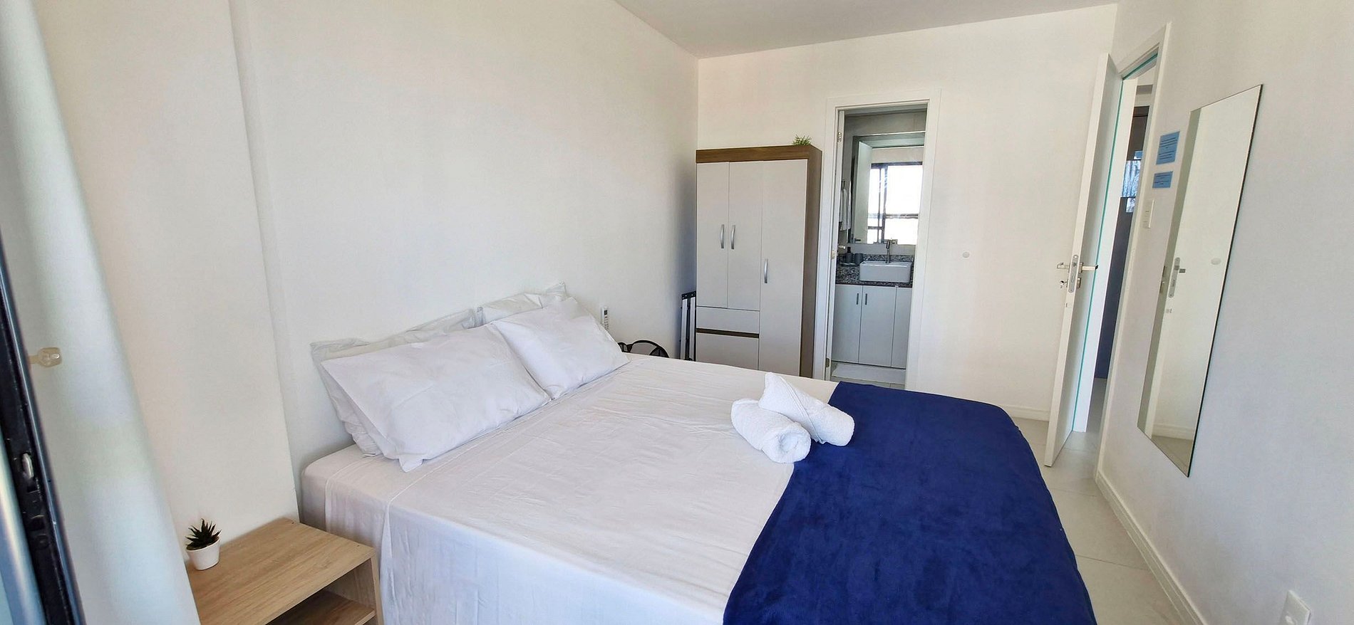 - QUARTO: cama queen, guarda-roupa, ar condicionado split, cortina blackout, espelho