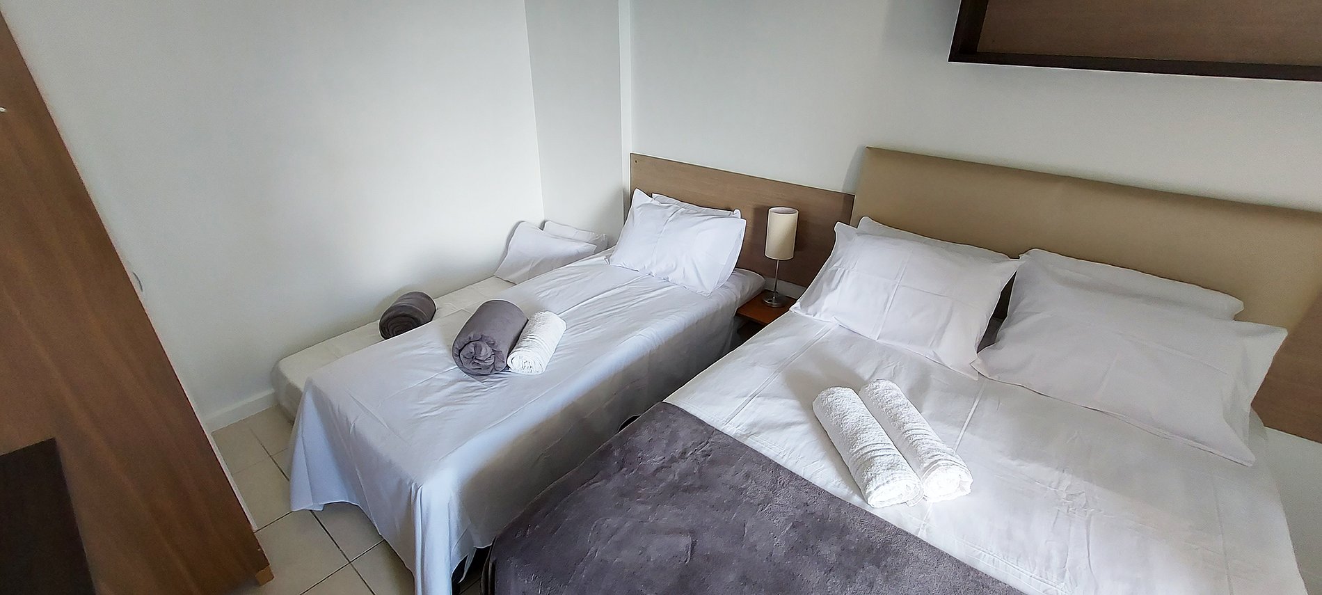 - Cama de casal, bicama de soltero, rack com espelho, secador de cabelo, ferro de passar com tábua portátil, guarda-roupa 4 portas, luminária, ventilador de teto, ar condicionado split