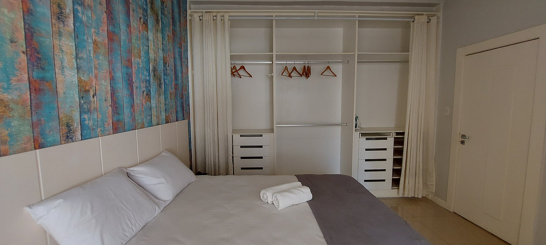 - Cama de casal, cortina blackout, guarda-roupa (a parte de cima fica trancada e não é para utilização do hóspede), cadeira de madeira, rack de madeira, ar condicionado split