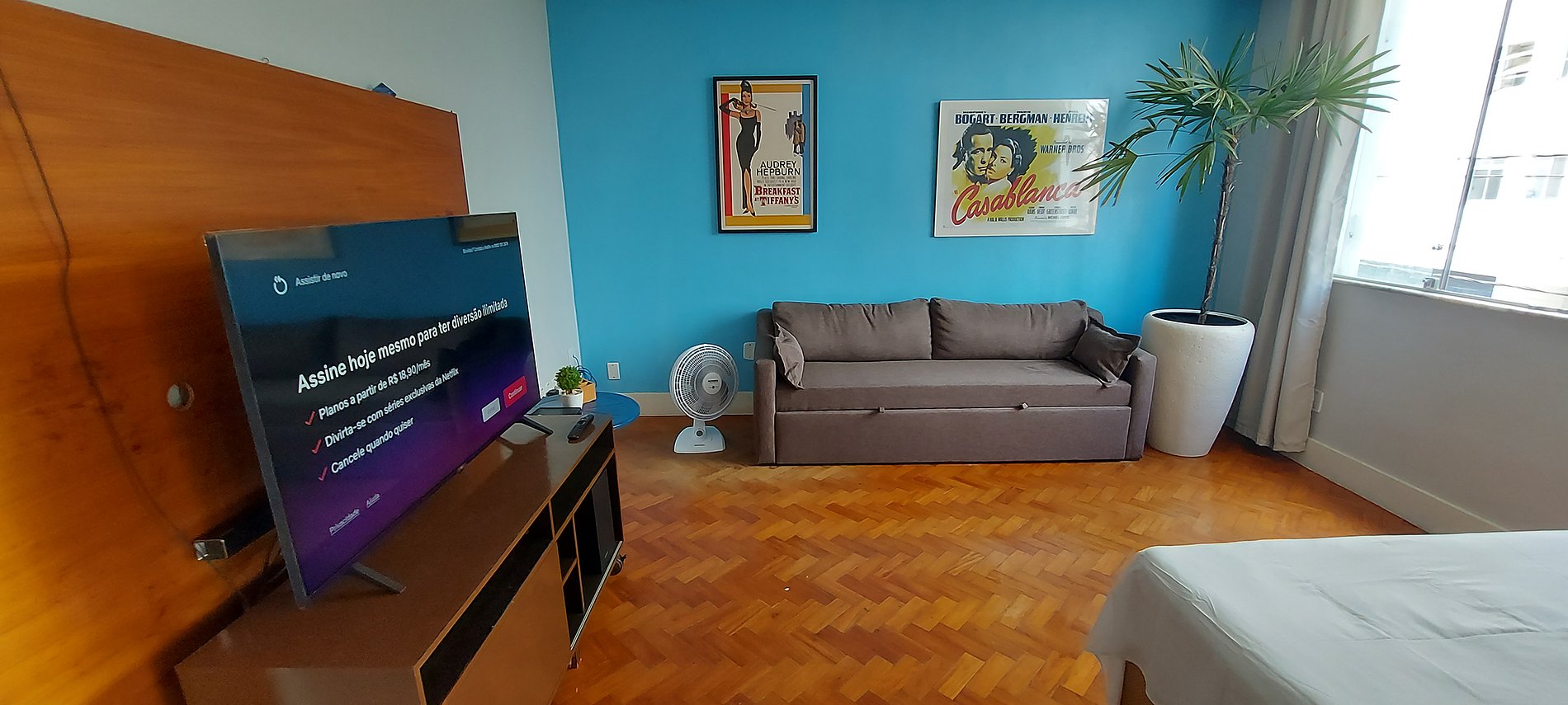 - Sofá-cama de casal, cama de solteiro, rack de madeira com painel e smart TV (sintoniza canais locais), mesa de centro redonda azul, ventilador de teto, ventilador de mesa, cortina blackout