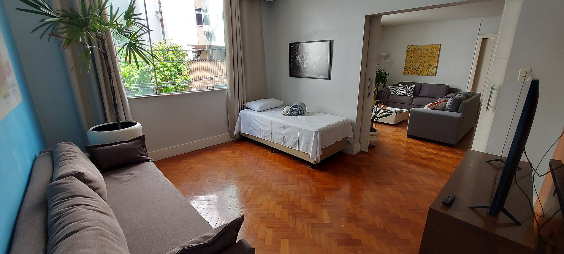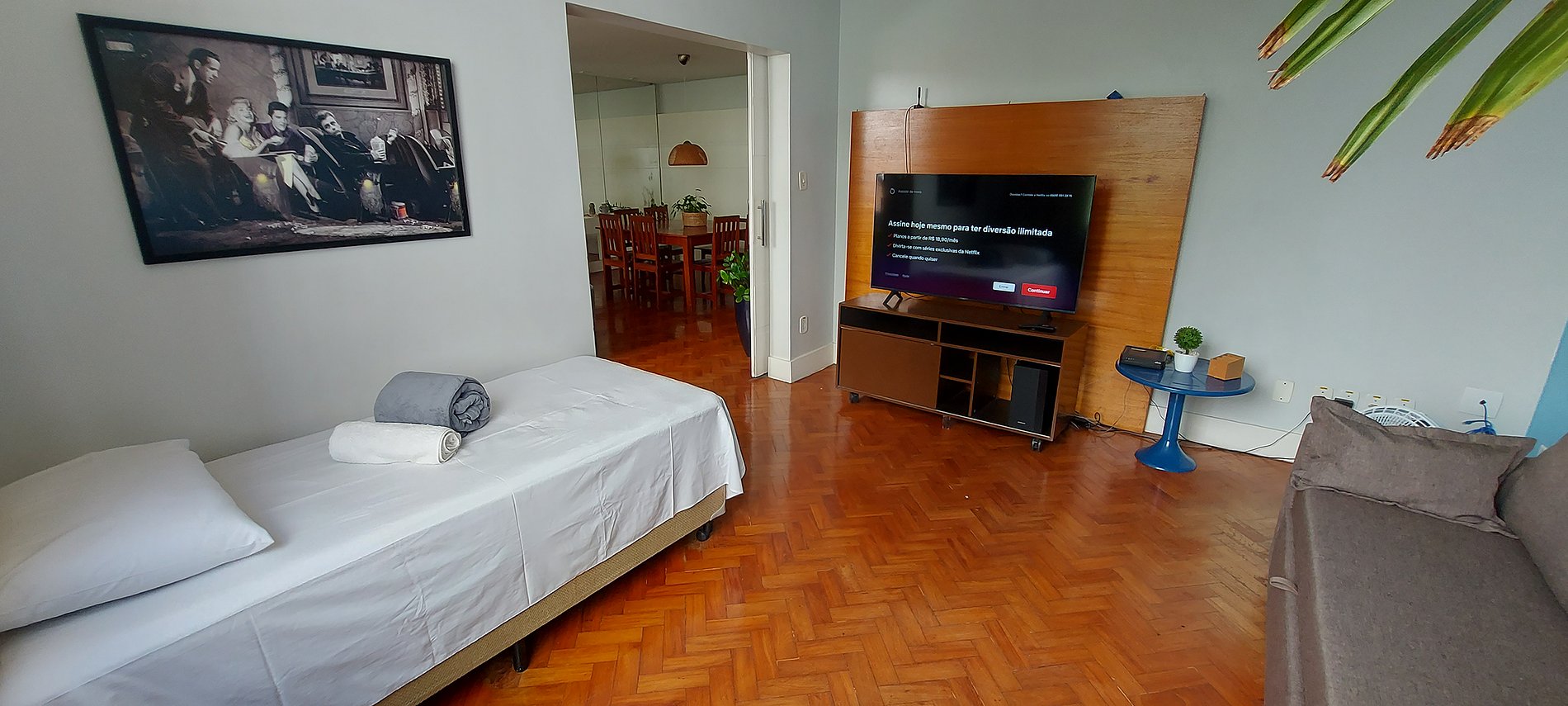 - A sala de TV anexa serve como o terceiro quarto, com porta de correr, sofá-cama casal e cama de solteiro. (esse cômodo não tem ar condicionado, tem ventilador)