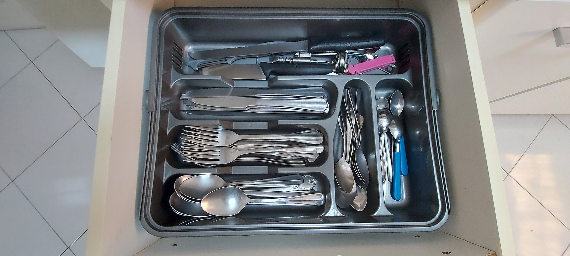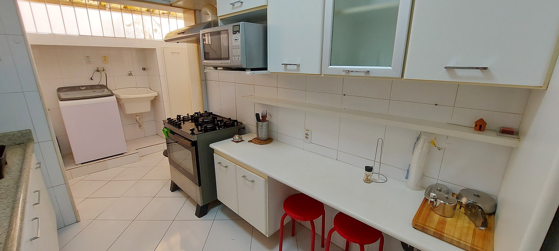 - Geladeira inverter, fogão a gás 5 bocas, sanduicheira, cafeteira elétrica, microondas, liquidificador, filtro de água, pia dupla, 2 banquinhos vermelhos, depurador de ar, panelas, itens básicos e acessórios de cozinha