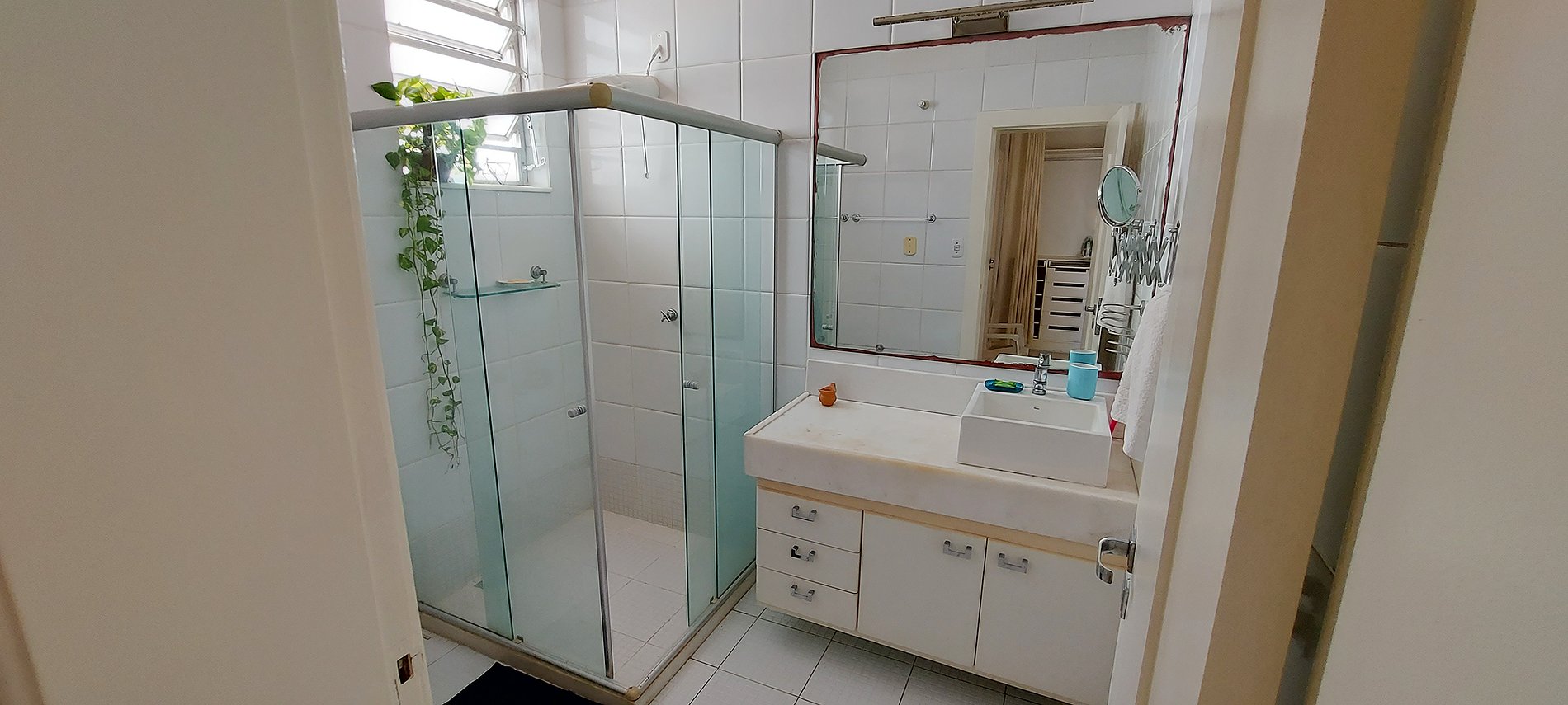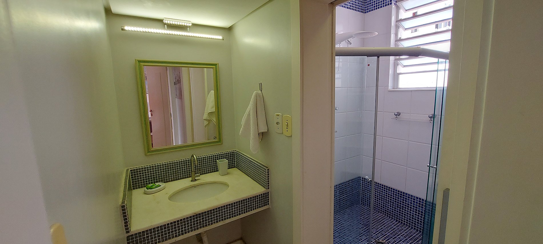 - Box de vidro, pia com armário, espelho, chuveiro elétrico, armário grande