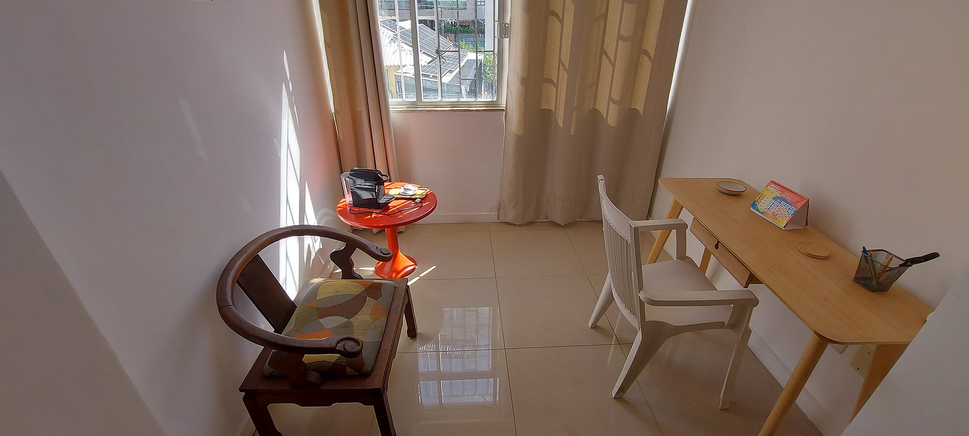 - Cama queen, ar condicionado split, guarda-roupa grande, 2 cadeiras plásticas, 1 cadeira de madeira, 2 mesinhas de cabeceira de madeira com abajur, ferro de passar, mesa de trabalho, mesinha redonda vermelha com cafeteira de cápsula Nespresso (traga a cápsula de sua preferência), cortina blackout, banheiro com box de vidro, pia com armário, espelho e chuveiro elétrico.