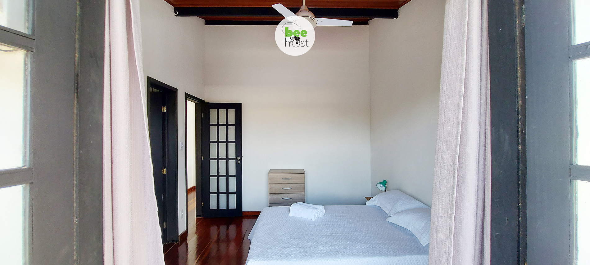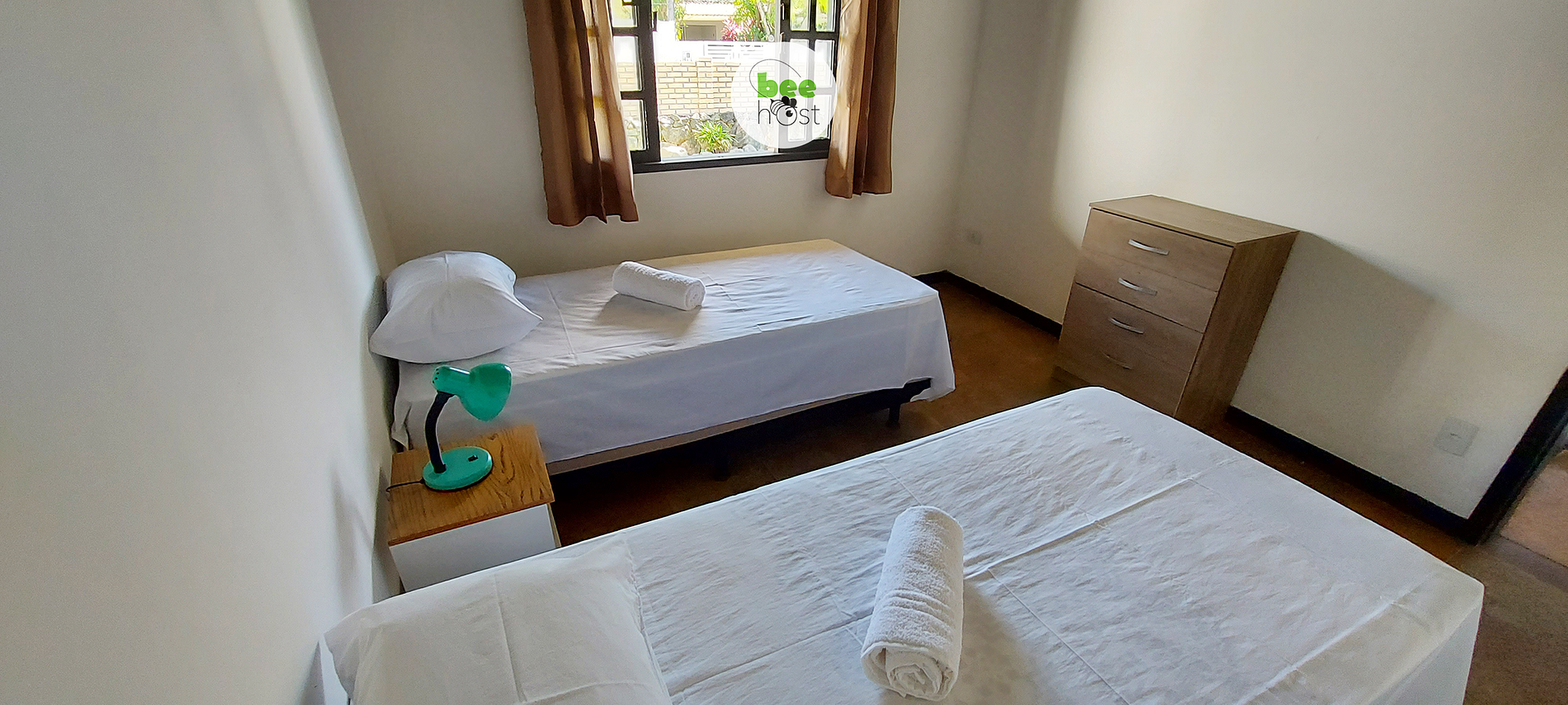 - Quarto 1: 2 camas de solteiro, mesa de canto com abajur, cômoda, cortina, ventilador de teto