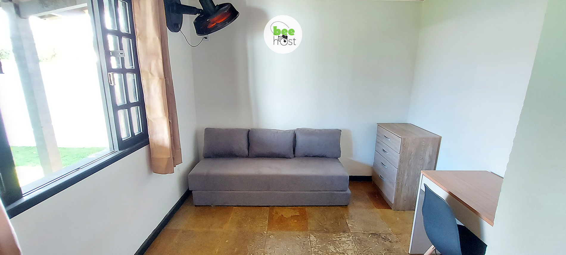 - Escritório: poltrona e mesa para trabalho, sofá, cômoda, ventilador de mesa preso no teto, cortina