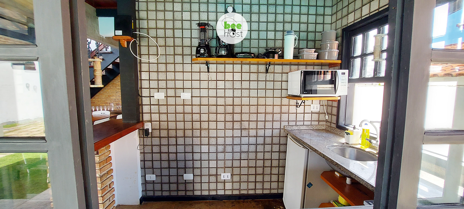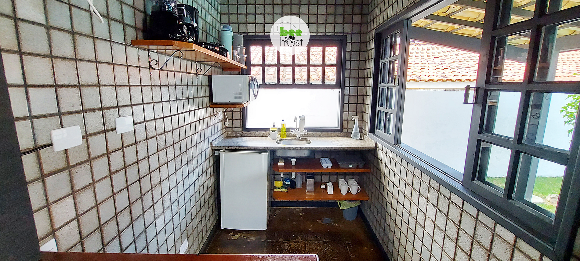 - Cozinha interna com liquidificador, máquina de café, sanduicheira, bule, garrafa térmica, microondas, filtro de água, frigobar e itens básicos de cozinha.