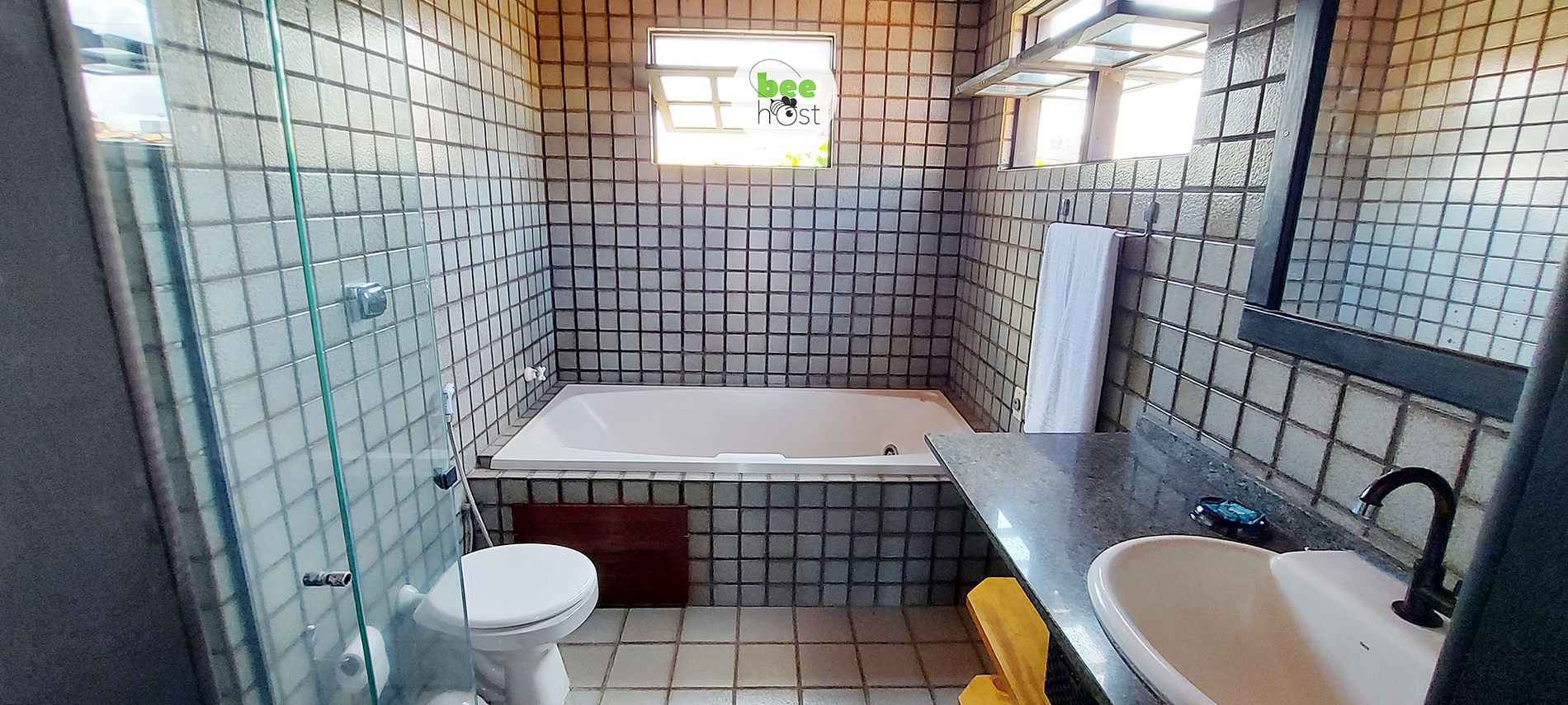 - Suíte 2: 1 cama casal, 2 mesas de canto, cortina, ar condicionado split, ventilador de teto, varanda, closet, e banheiro com banheira de hidromassagem (não esquenta a água), chuveiro elétrico e espelho.