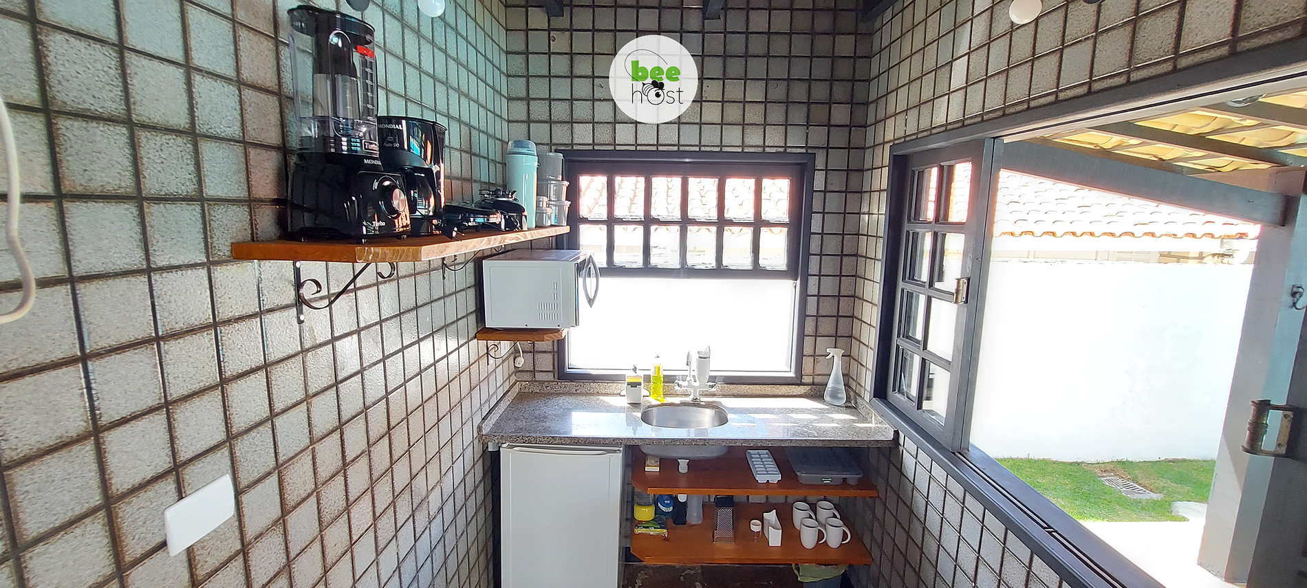 - Cozinha interna com liquidificador, máquina de café, sanduicheira, bule, garrafa térmica, microondas, filtro de água, frigobar e itens básicos de cozinha.