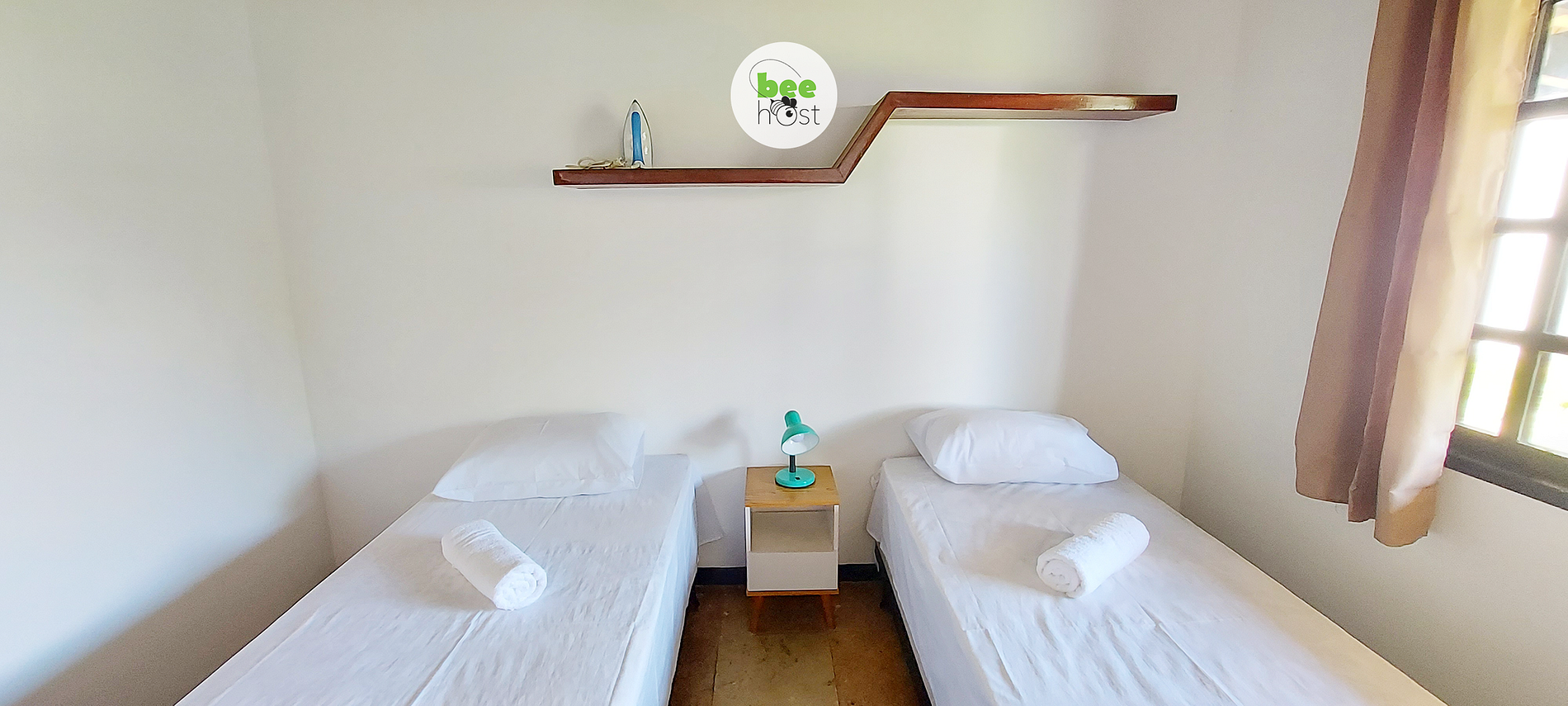 - Quarto 1: 2 camas de solteiro, mesa de canto com abajur, cômoda, cortina, ventilador de teto