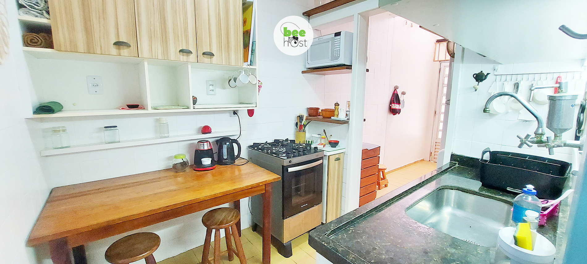 - Cozinha com mesa de madeira e dois bancos, garrafa térmica, geladeira duplex, microondas, fogão 4 bocas, liquidificador, filtro de água, cuscuzeira, panela de pressão, copos, pratos, talheres, taças, potes e todos os itens básicos.