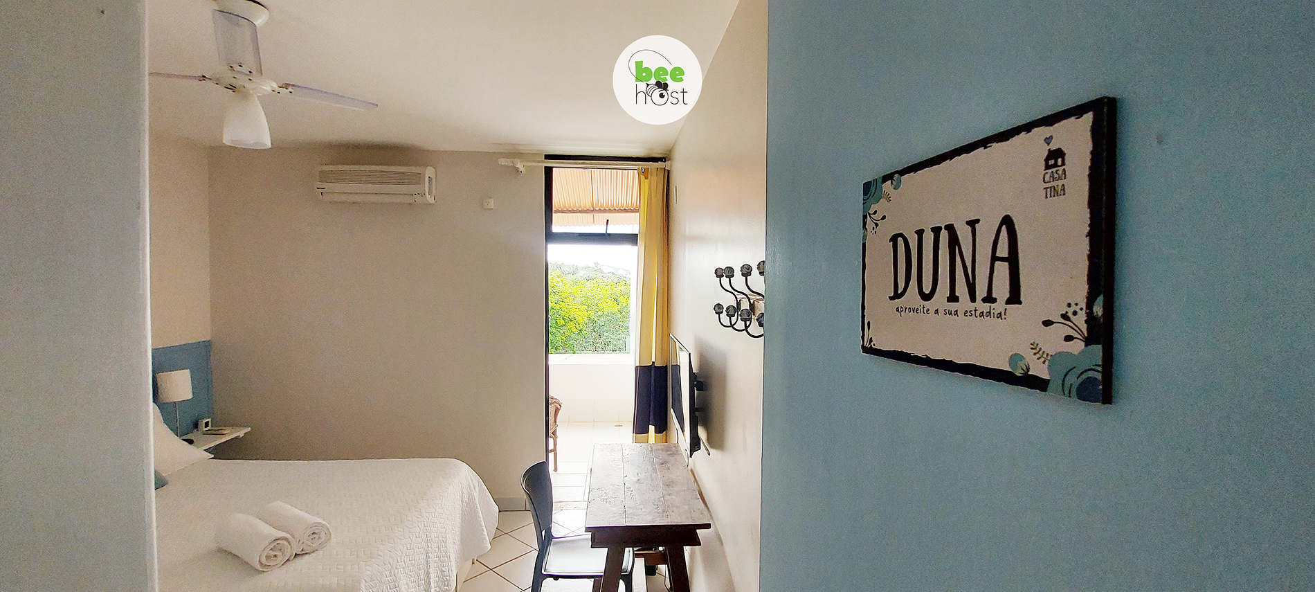 - Quarto DUNA: Andar de cima, 1 cama casal, 2 prateleiras de canto com abajur, guarda-roupa, ventilador de teto, ar condicionado split, mesa de trabalho com cadeira e smartTV (não tem canal local), varanda com duas cadeiras