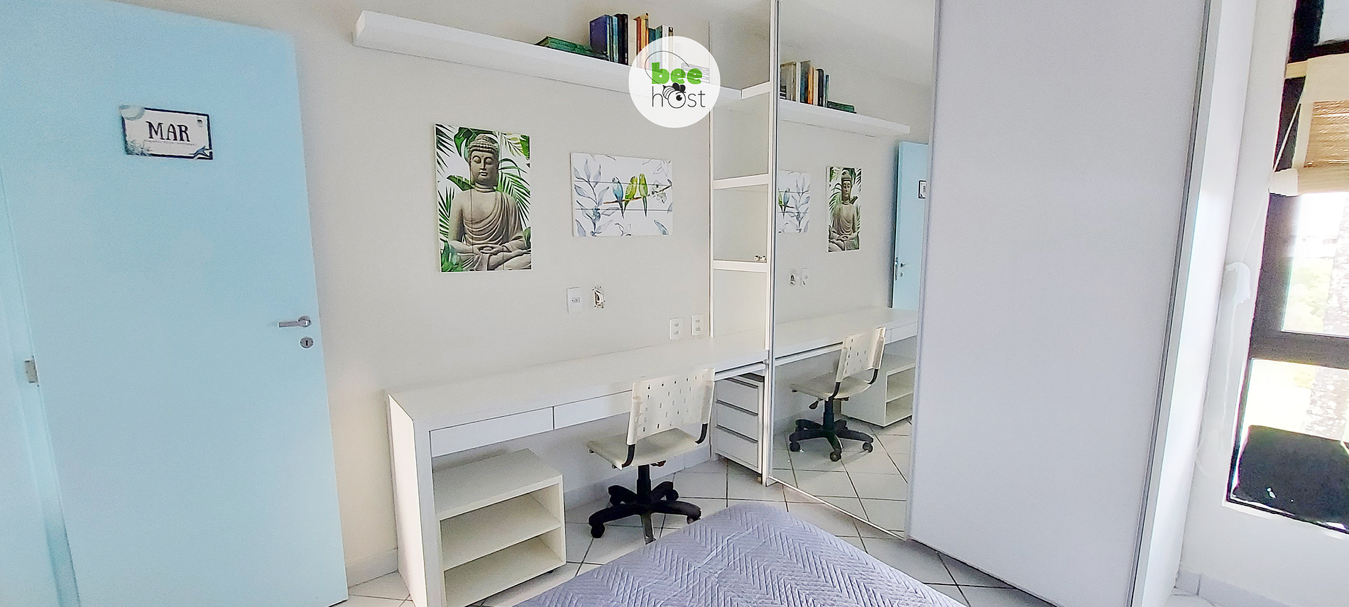 - Quarto MAR: Andar de cima, 1 cama de casal, 1 colchão de solteiro, bancada de trabalho com cadeira, quadros decorativos, guarda-roupa, com espelho, prateleira grande com livros, mesinha com abajur, cabideiro, ar condicionado de janela