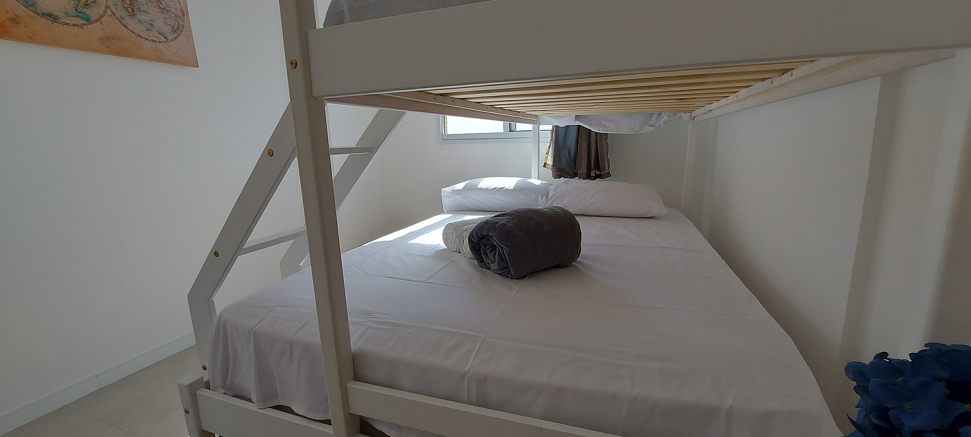 - A cama no quarto é um "triliche para 4 pessoas": trata-se de uma cama de casal, com uma cama de solteiro em cima e uma cama de solteiro de puxar embaixo (VIDE FOTO).