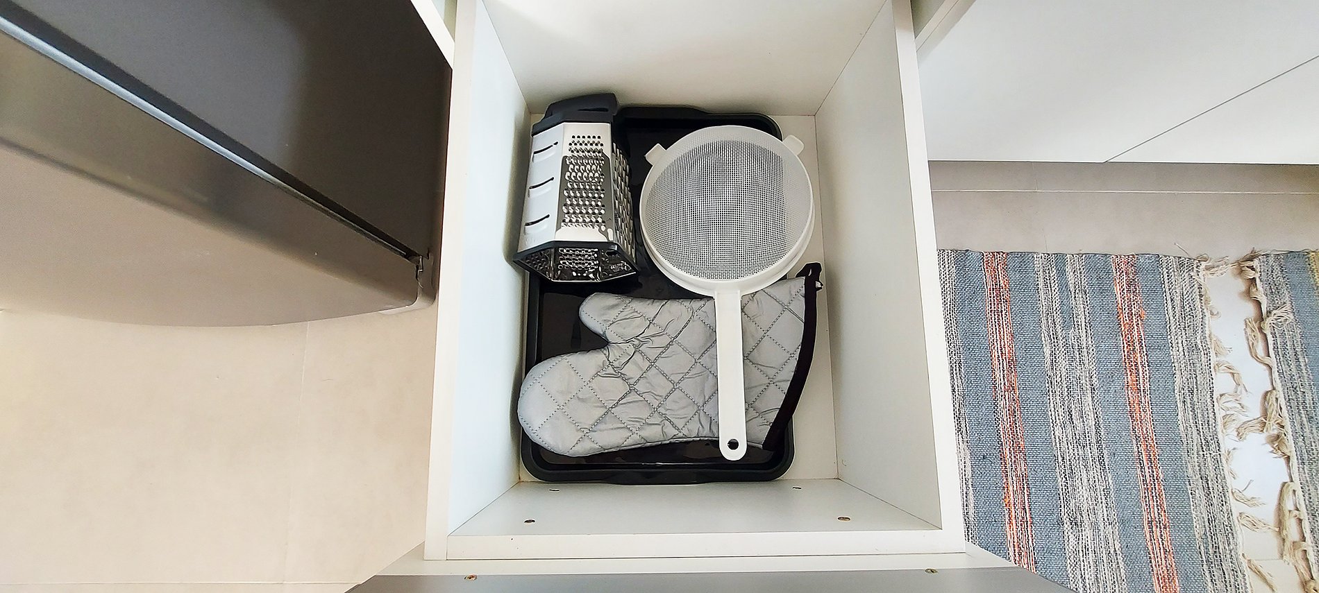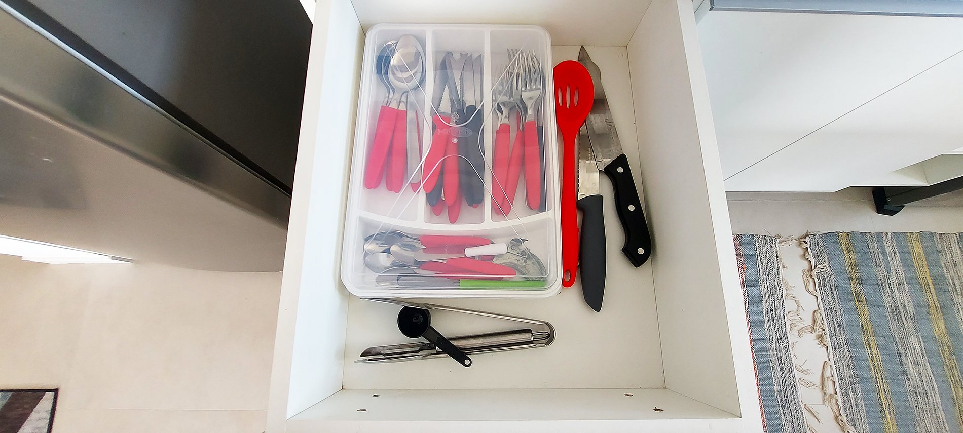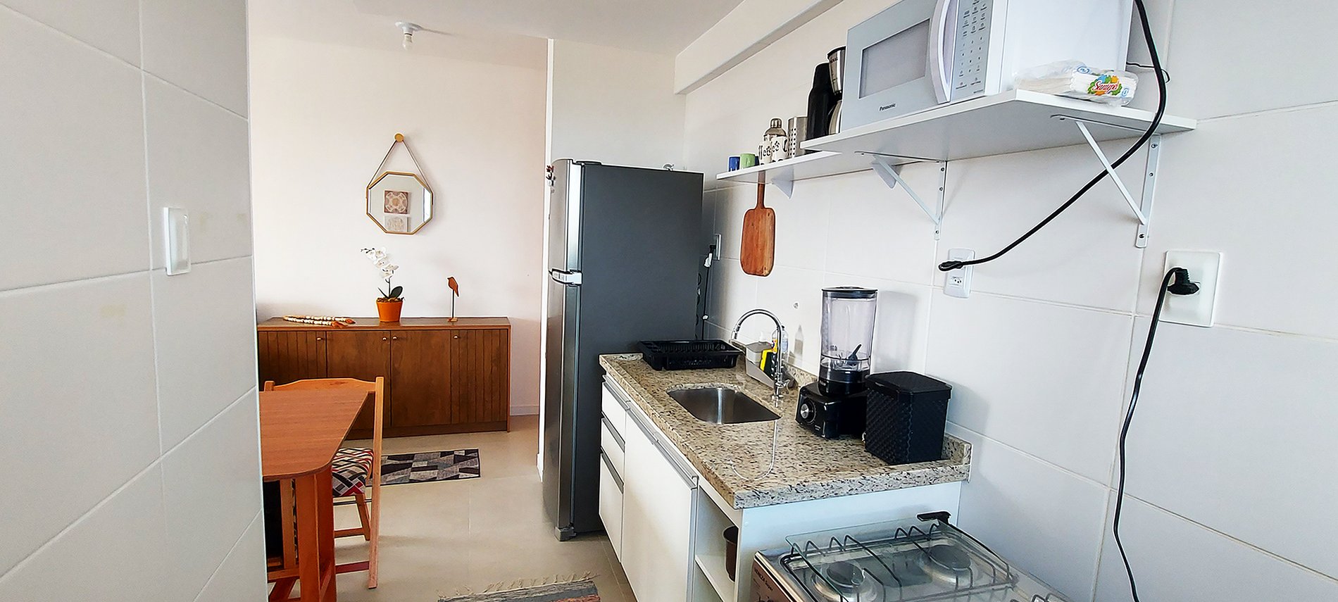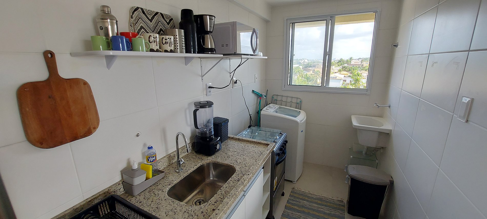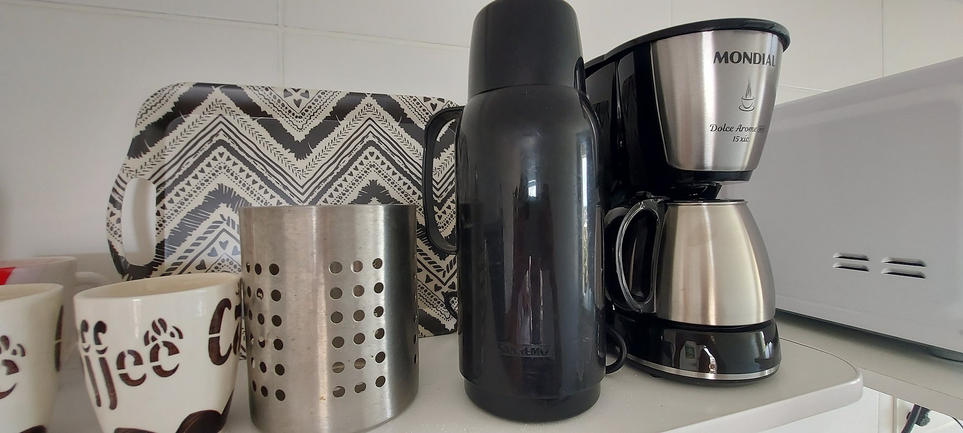 - Geladeira duplex, fogão 4 bocas, microondas, liquidificador, cafeteira elétrica, garrafa térmica, cuscuzeira, panela de pressão, panelas, potes, talheres, canecas, copos e taças.