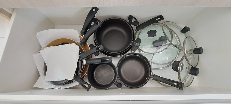 - tábua de cortar de madeira, copos, taças, xícaras, panelas diversas, panela de pressão, cuscuzeira, forma de bolo, talheres e acessórios básicos de cozinha