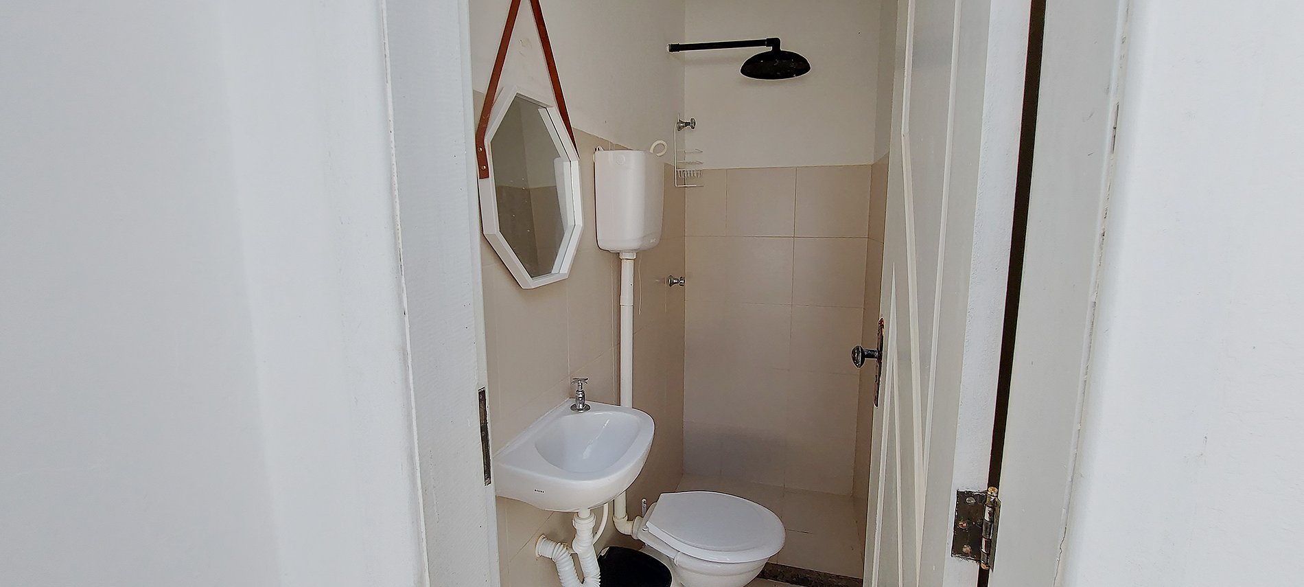 - banheiro com pia, chuveiro (sem box) e espelho