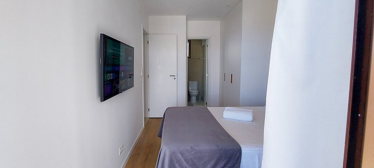 - SUÍTE: cama casal, smart TV, guarda-roupa, ar condicionado split, cortina blackout, porta de vidro de correr com saída para varanda, banheiro com armário, espelho, box, luzes LED, ducha higiênica e chuveiro elétrico