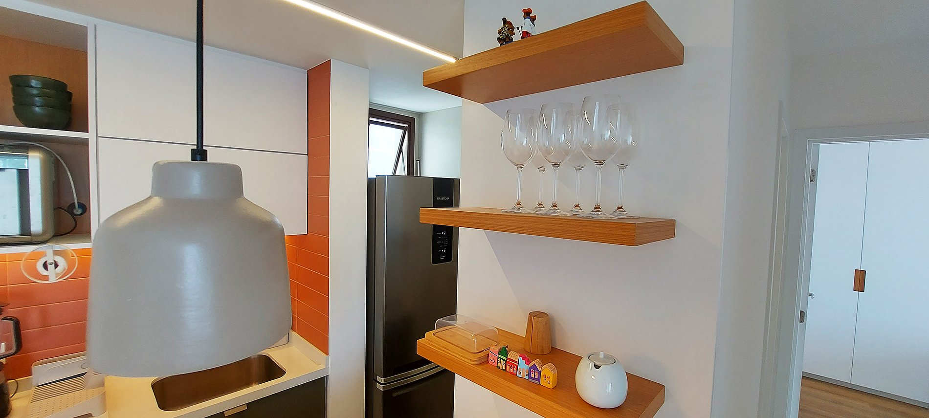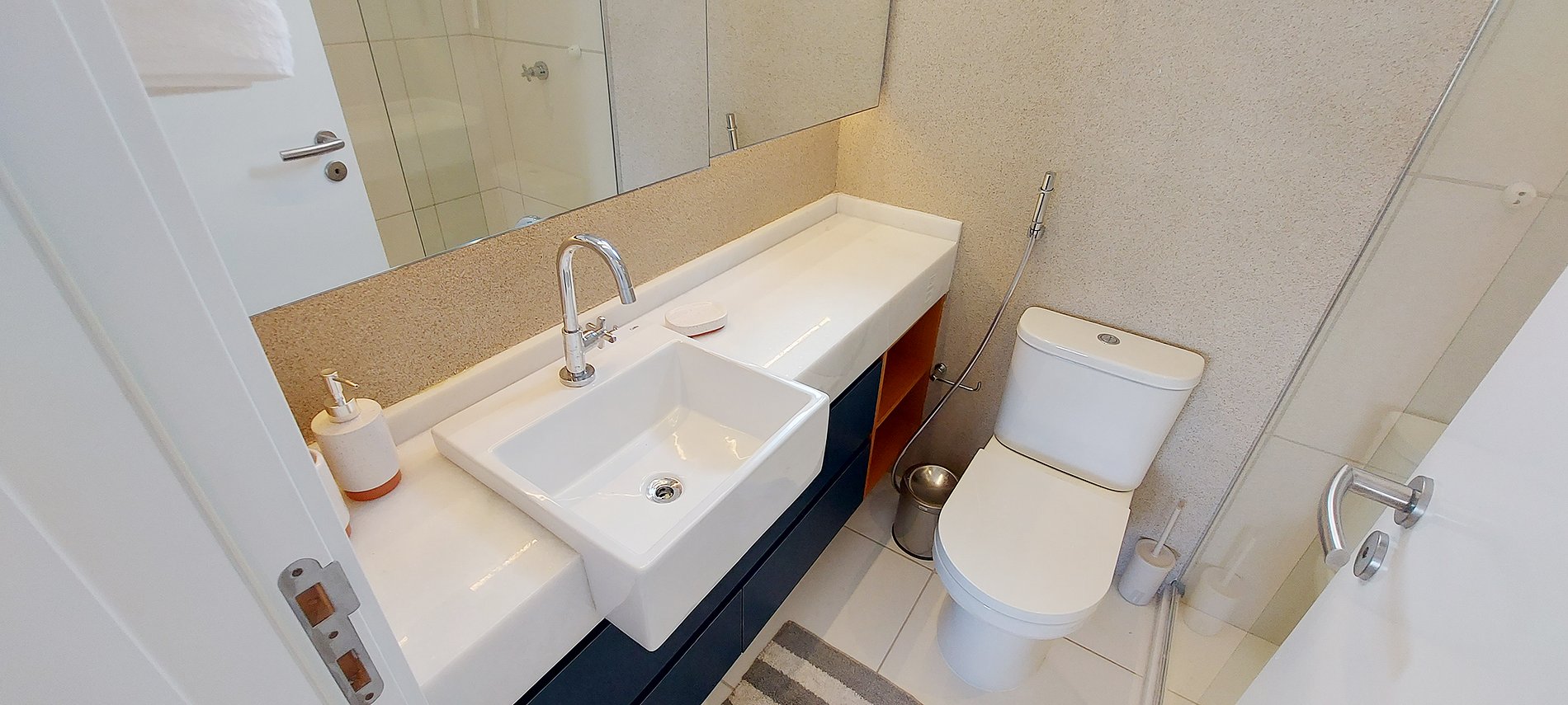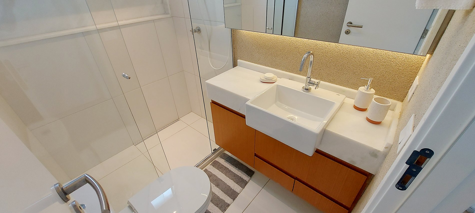 - BANHEIRO SOCIAL: armário, espelho, box, luzes LED, ducha higiênica e chuveiro elétrico
