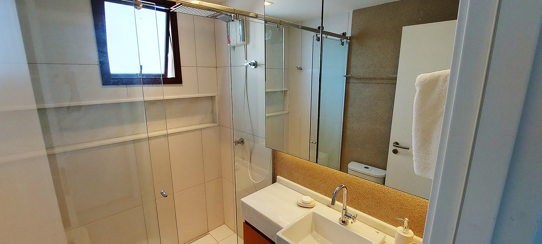 - SUÍTE: cama casal, smart TV, guarda-roupa, ar condicionado split, cortina blackout, porta de vidro de correr com saída para varanda, banheiro com armário, espelho, box, luzes LED, ducha higiênica e chuveiro elétrico