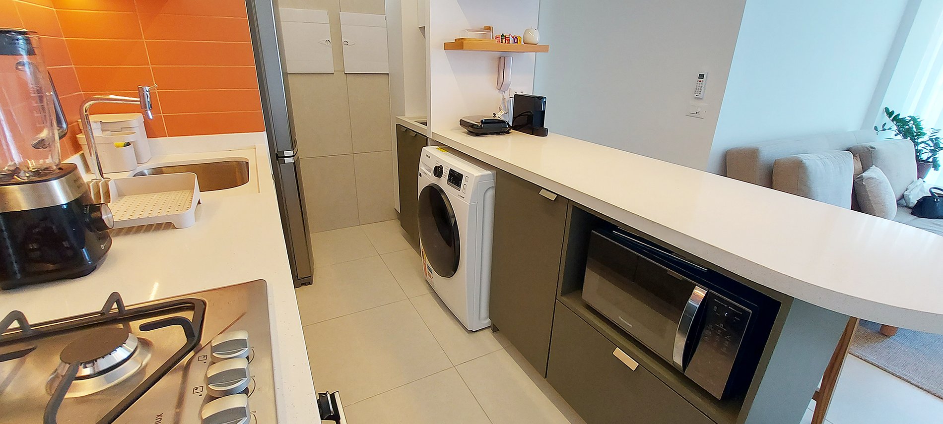 - COZINHA: bancada americana com 2 bancos altos de madeira, interfone, filtro de água, geladeira duplex, cooktop 4 bocas, depurador de ar, forno elétrico, microondas, liquidificador, sanduicheira, cafeteira de cápsula Nespresso (traga a cápsula de sua preferência), chaleira, garrafa térmica, mixer, copos, taças, xícaras, panelas e utensílios básicos de cozinha