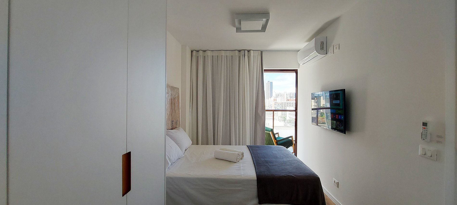 - QUARTO: cama casal, smart TV, guarda-roupa, ar condicionado split, cortina blackout, porta de vidro de correr com saída para varanda, colchão extra de solteiro para colocar no chão
