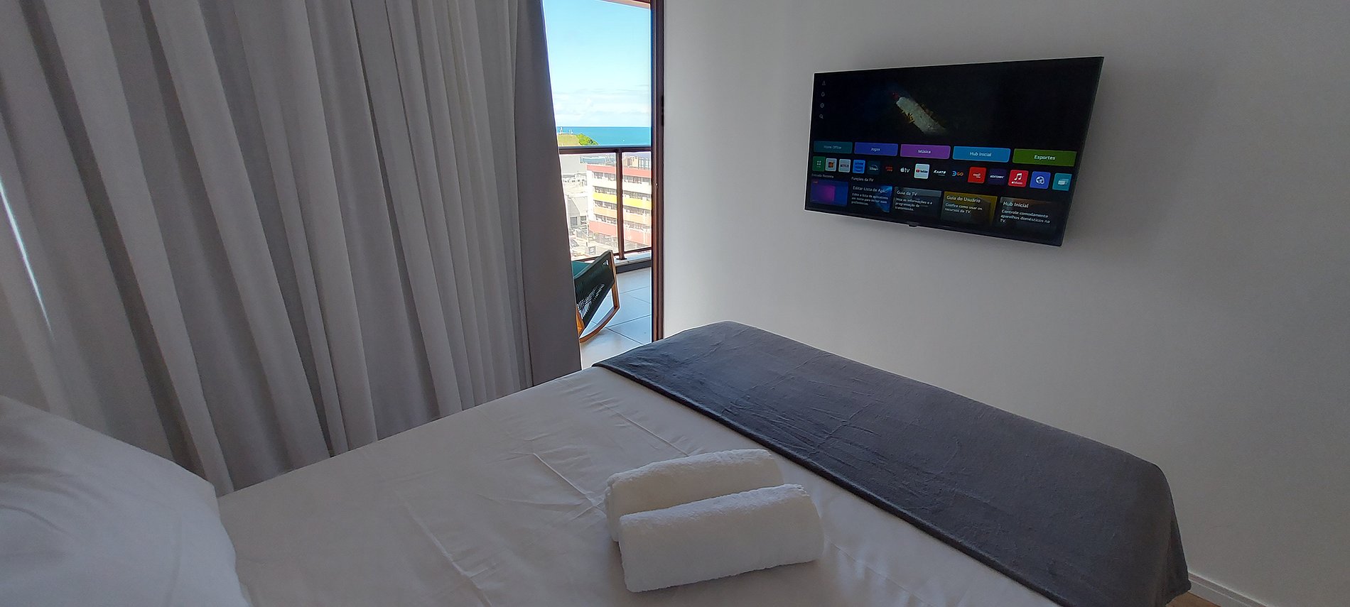 Lindo apartamento de 2 quartos com varanda grande vista mar, localizado em condomínio novo na Barra! Pertinho do shopping Barra e do circuito do Carnaval Barra-Ondina! Com smart TV na sala e no quarto, WI-FI, ar condicionado split, cozinha completa. Cobertura com piscina e academia. Tem garagem e recepção 24hs.
