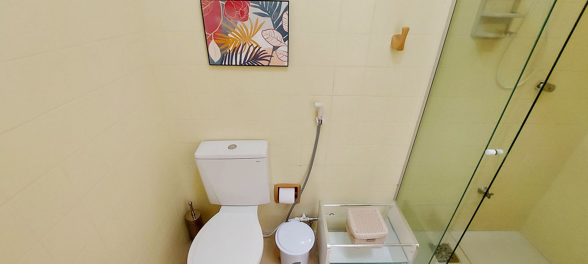 - Vaso sanitário, box, chuveiro elétrico, mesa de apoio, ducha higiênica, espelho, cesto de roupa