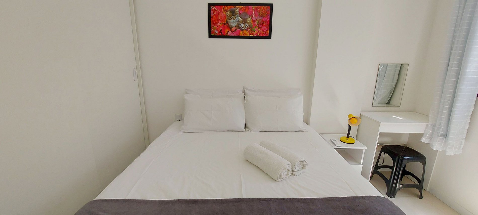 - Quarto com cama queen, guarda-roupa, ar condicionado split, mesa e banco para trabalho, espelho, mesa de cabeceira com abajur, ferro de passar, secador de cabelo, cortina blackout