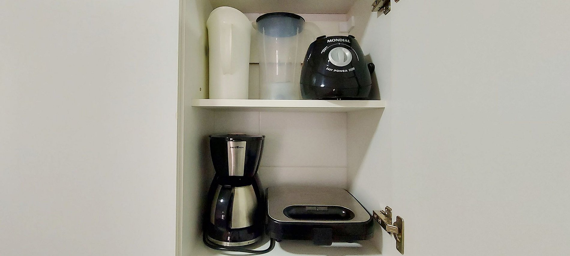 - Cozinha com geladeira, cooktop 4 bocas a gás, forninho elétrico, depurador de ar, filtro de água, garrafa térmica, sanduicheira, microondas, liquidificador, cafeteira elétrica, panela de pressão e itens básicos de cozinha