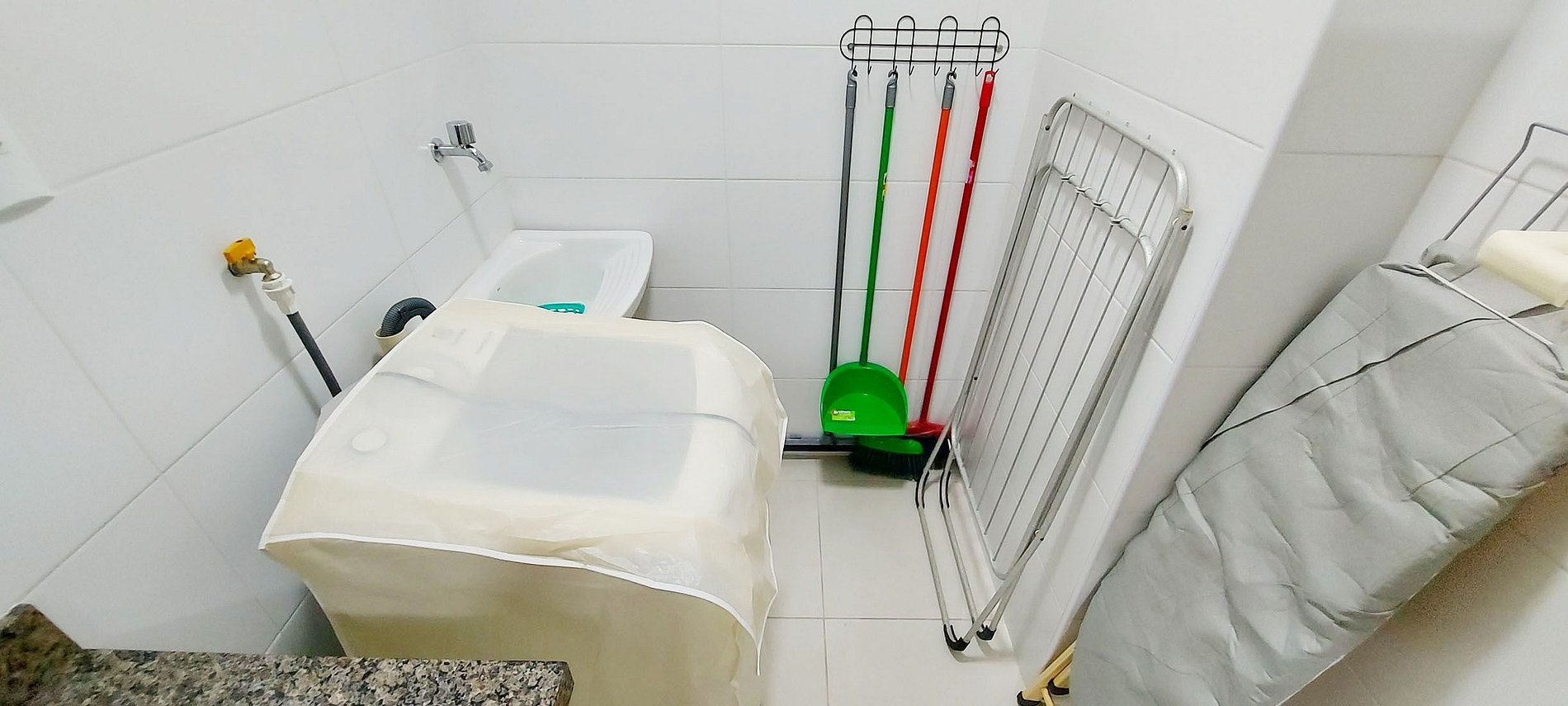 - Área de serviço com pia, varal de chão e varal suspenso, máquina de lavar, tábua de passar, 2 baldes