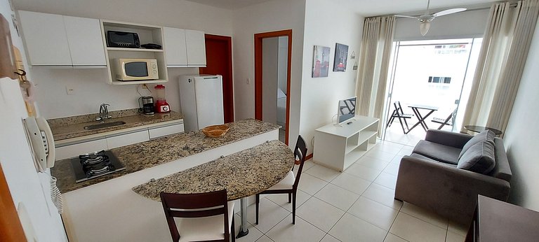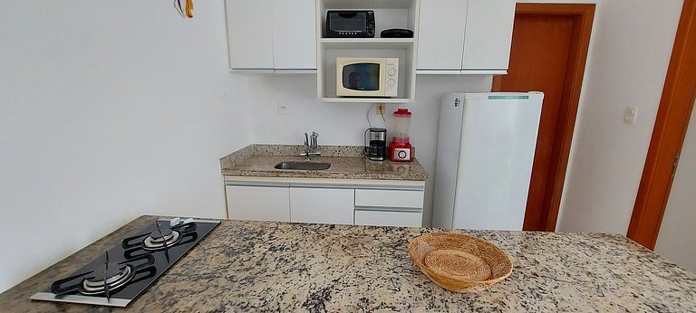 - Cozinha com geladeira, cooktop, filtro de água, micro-ondas, liquidificador, cafeteira, panela de pressão