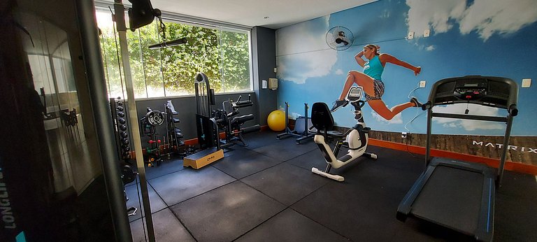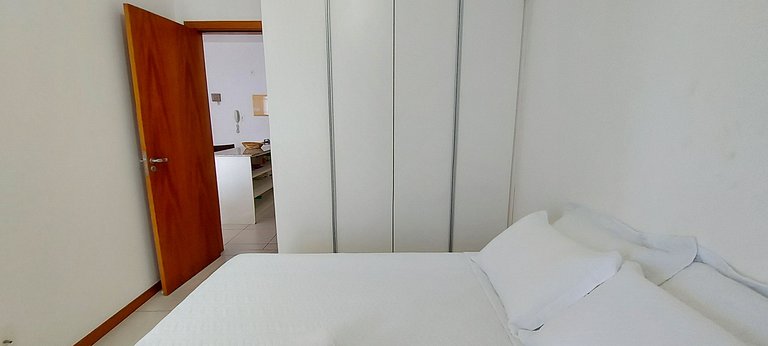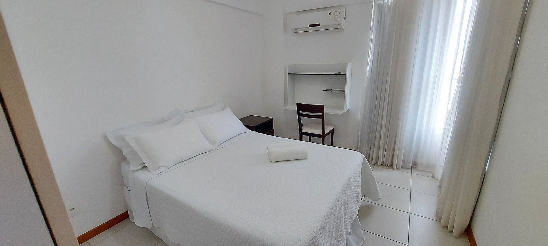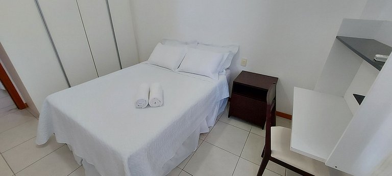 - Quarto com cama queen, guarda-roupa, ar condicionado split, ferro de passar