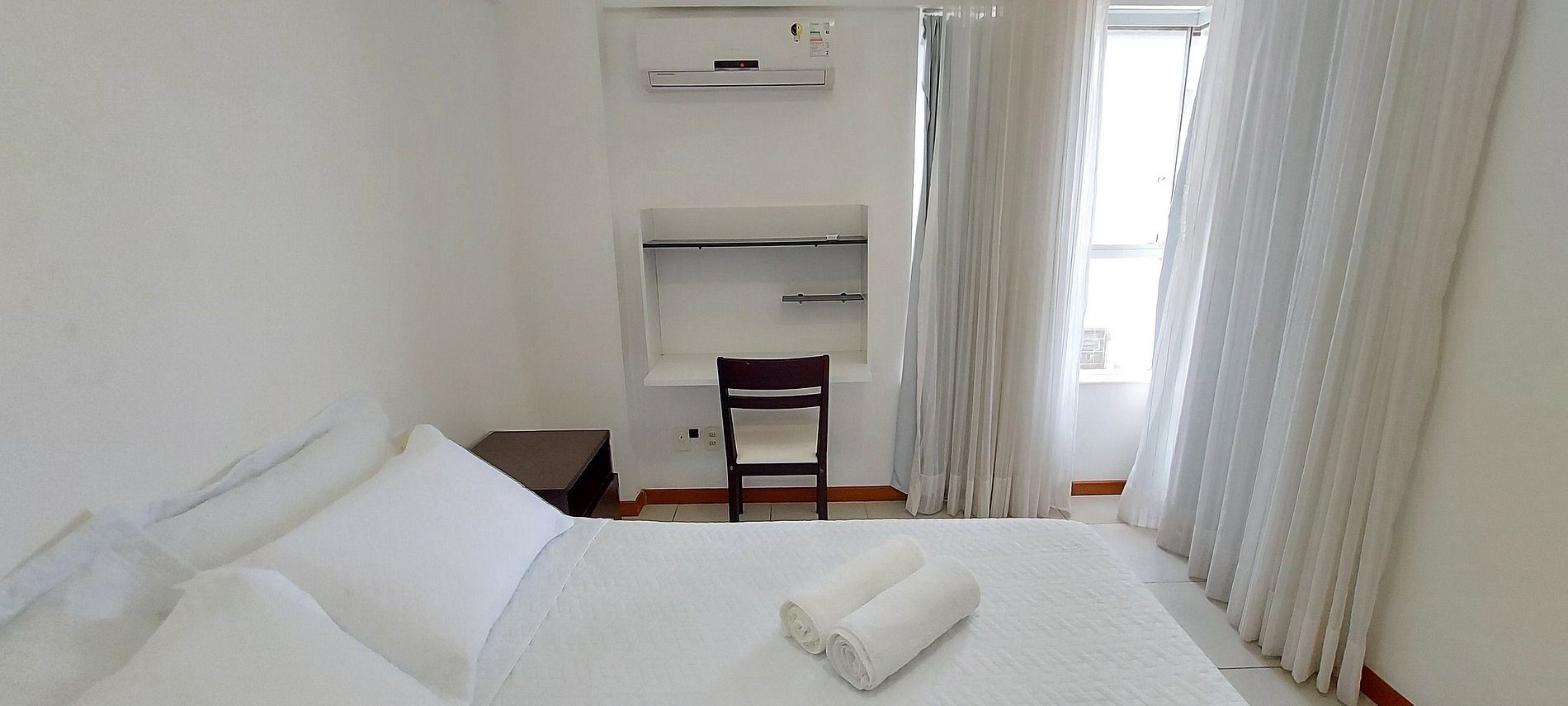 - Quarto com cama queen, guarda-roupa, ar condicionado split, ferro de passar