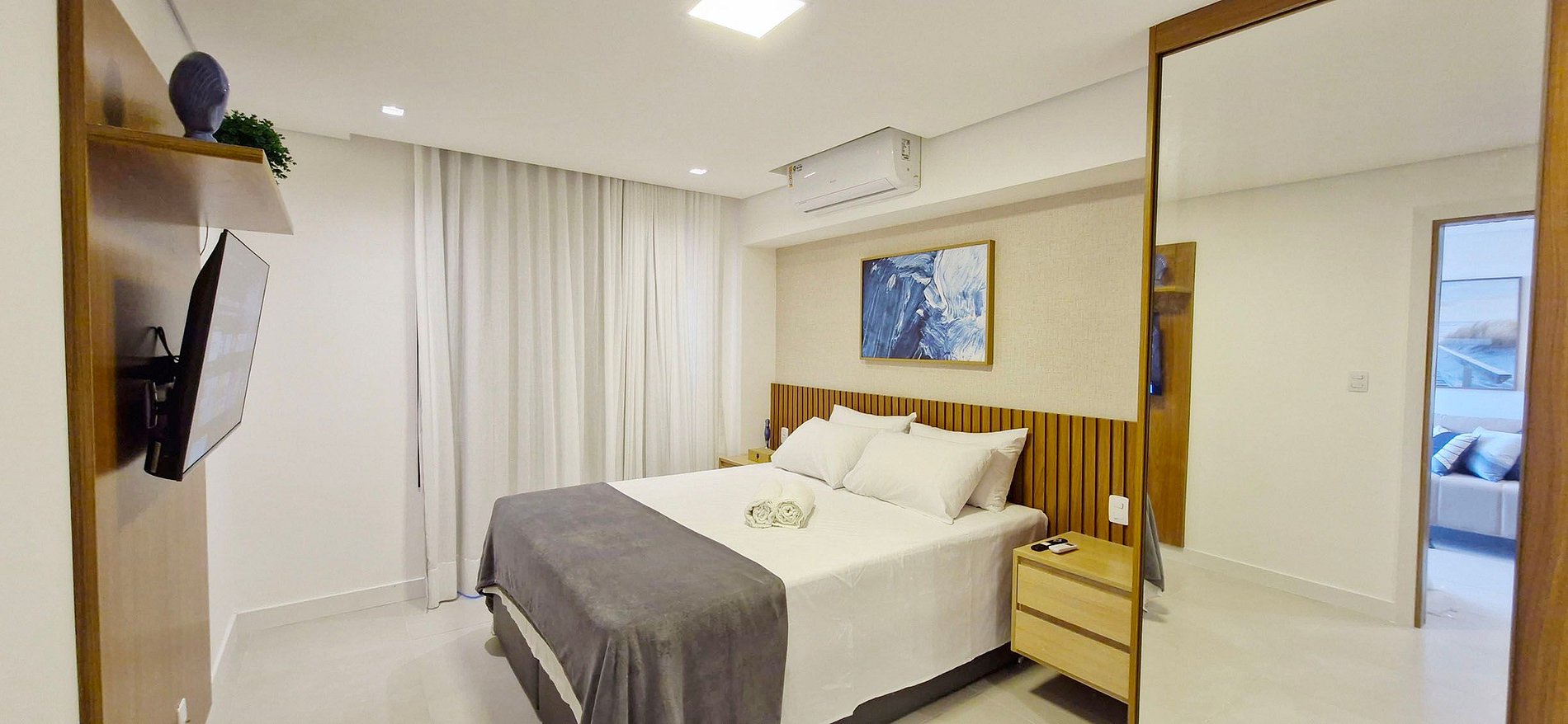 - Cama queen, 2 mesinhas de cabeceira de madeira, ar condicionado split, rack com smart TV (apps e canais locais), 2 guarda-roupas, espelho grande, tabua e ferro de passar dentro do guarda-roupa, cortina blackout, quadro e itens decorativos