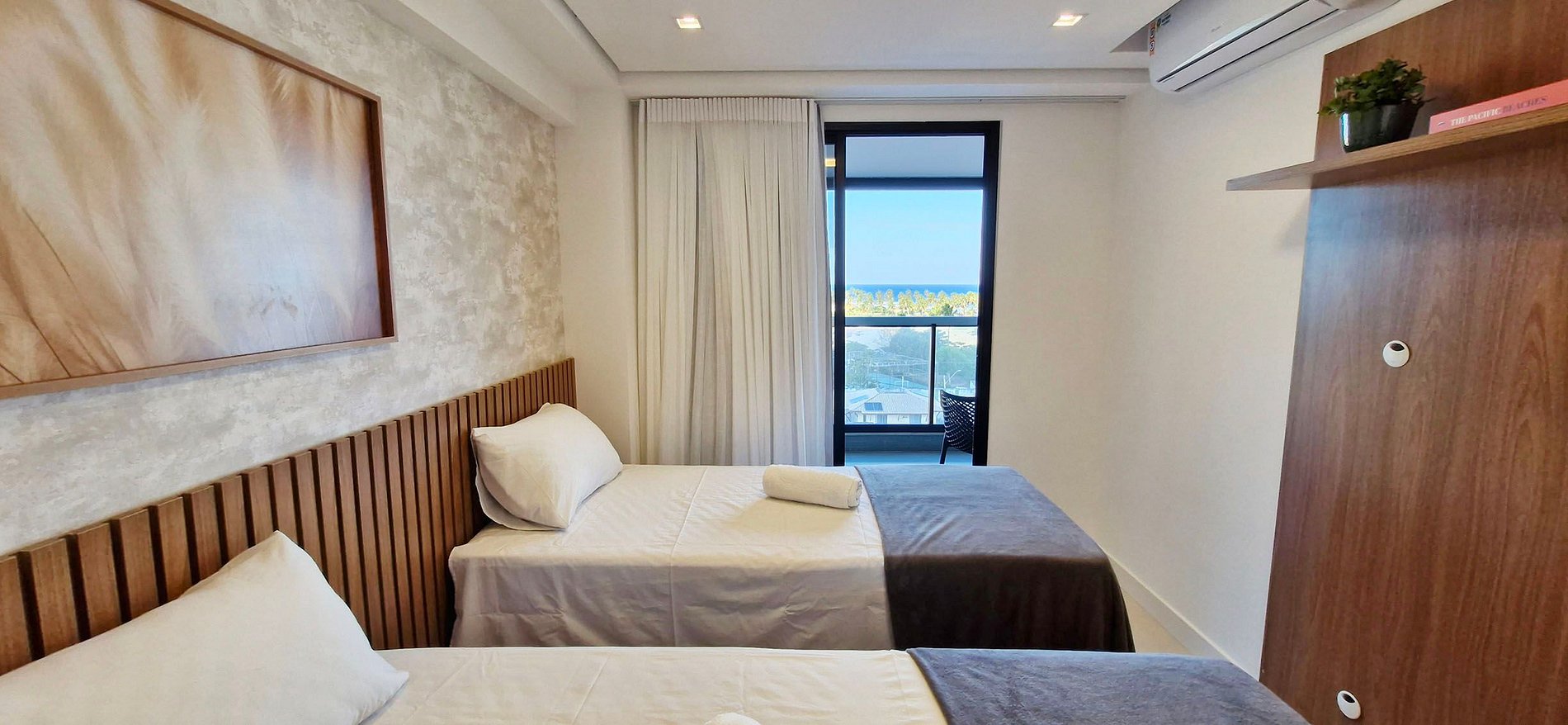 - 2 camas de solteiro, ar condicionado split, porta de vidro para a varanda, cortina blackout, rack de madeira, 1 mesinha de cabeceira, guarda-roupa com espelho, quadro decorativo