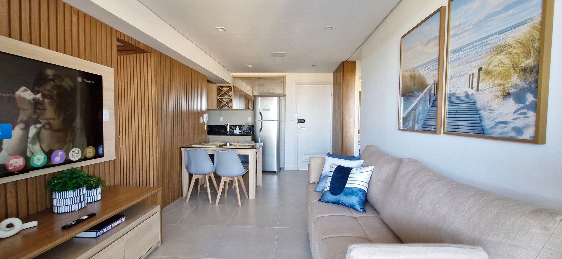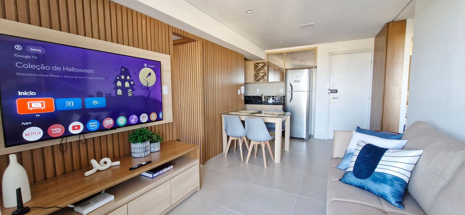 - Sofá 4 lugares, rack de madeira com smart TV (apps e canais locais), porta de correr para a varanda, cortina fina, 2 mesinhas de canto redondas, mesa para refeição de madeira com tampo de vidro e 4 cadeiras, interfone, WI-FI, 2 quadros e itens decorativos