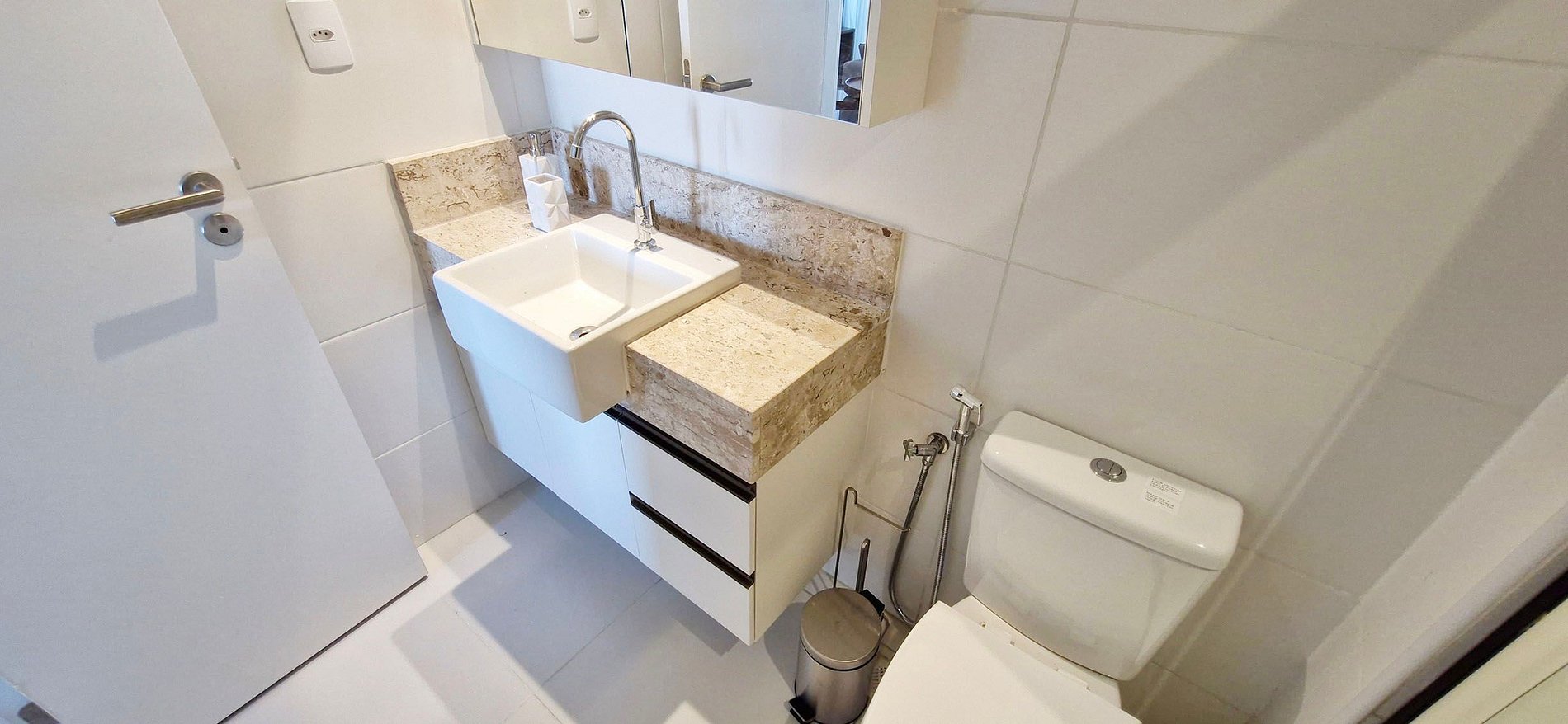 - Banheiro com pia, armário, espelho grande, box blindex, chuveiro elétrico, secador de cabelo