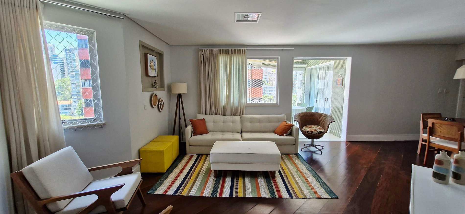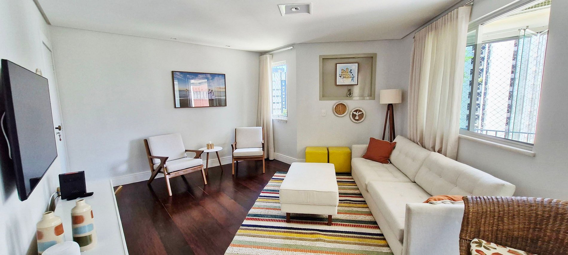 SALA DE ESTAR - sofá grande, 2 puffs amarelos, 2 cadeiras acolchoadas, mesinha redonda, puff acolchoado retangular, 2 almofadas, abajur de pé, poltrona de vime, rack com itens decorativos e WI-FI, tapete, smart TV com apps e canais locais, cortina persiana, quadros decorativos