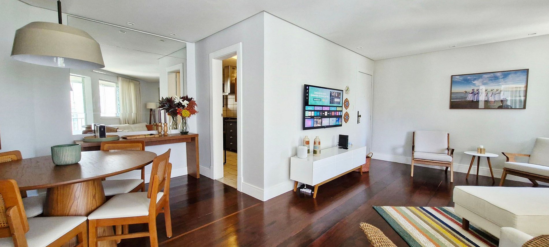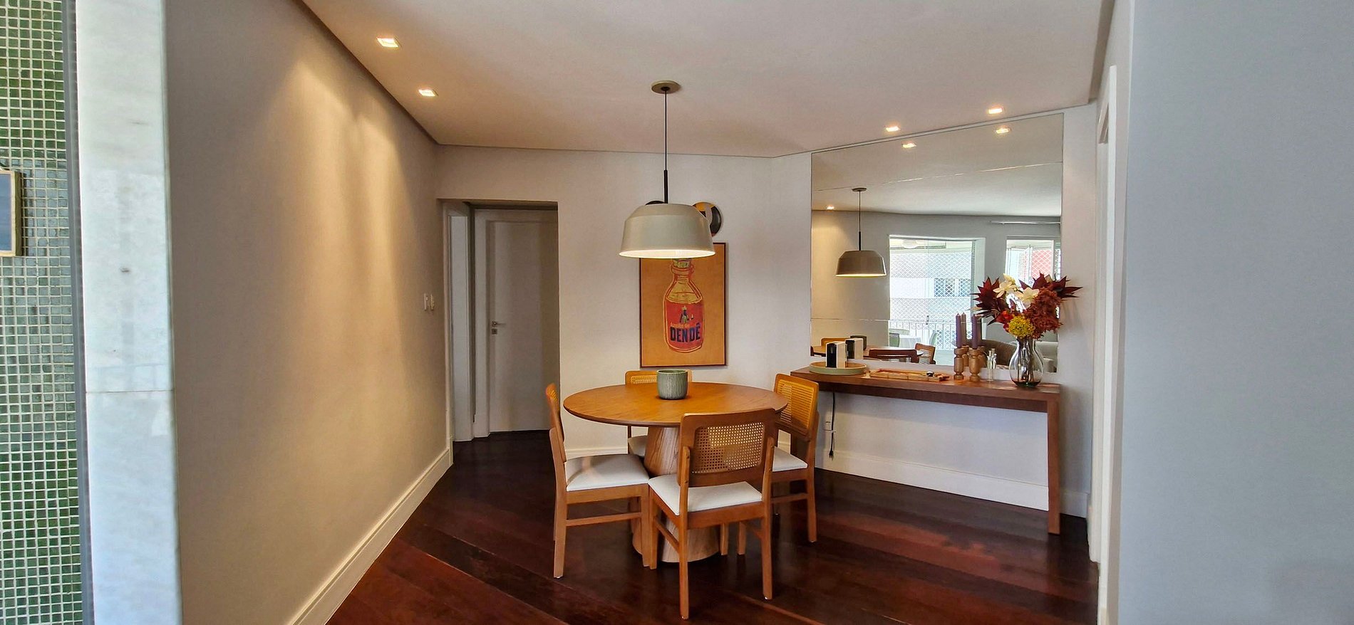 SALA DE JANTAR - mesa redonda de madeira com 4 cadeiras, luminária, espelho grande, aparador com cafeteira Nespresso de cápsulas (traga a de sua preferência) e itens decorativos, quadro grande
