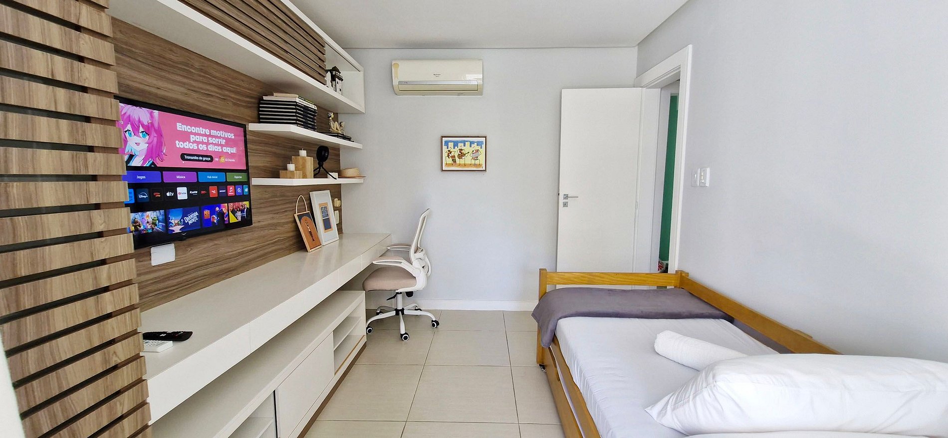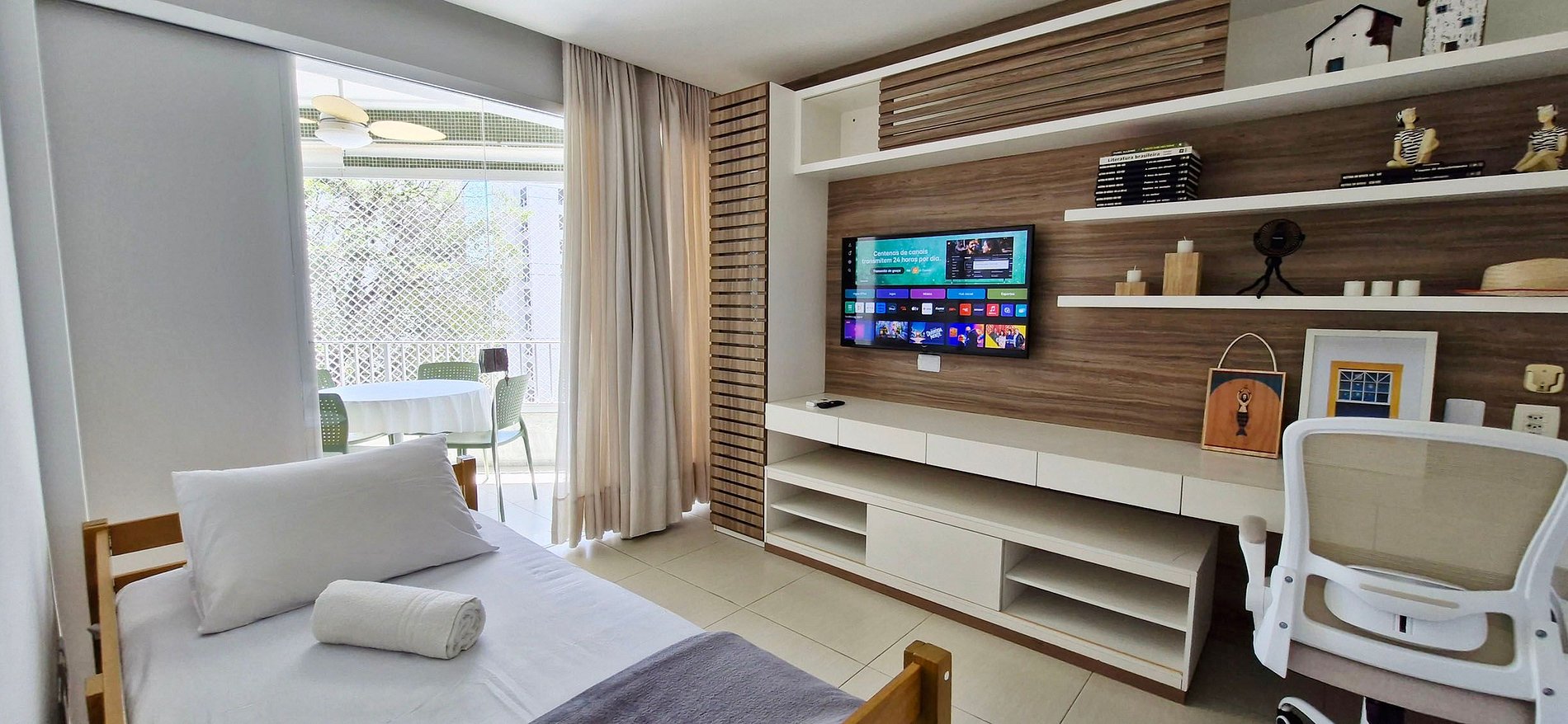QUARTO 2 - bicama de solteiro, estante com mesa de trabalho, poltrona, rack, smart TV com apps e canais locais, ar condicionado split, cortina, porta de vidro para a varanda, livros e itens decorativos