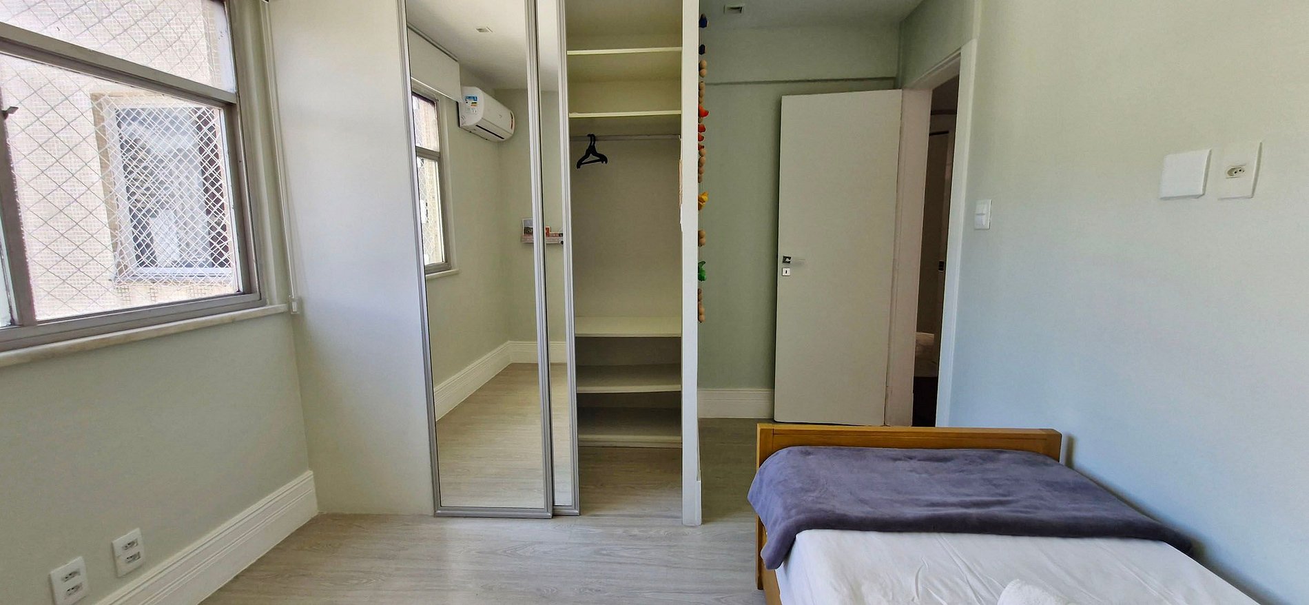 QUARTO 3 - bicama de solteiro, ar condicionado split, cortina blackout, tela de proteção, guarda-roupas com espelho e itens decorativos