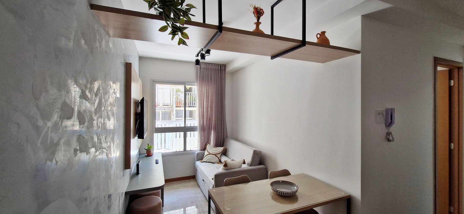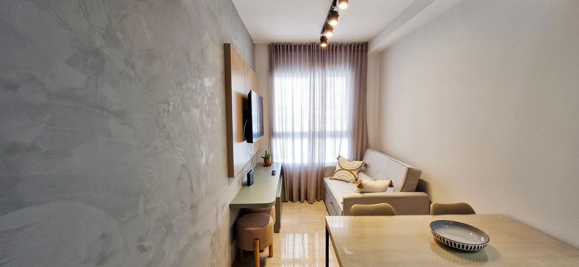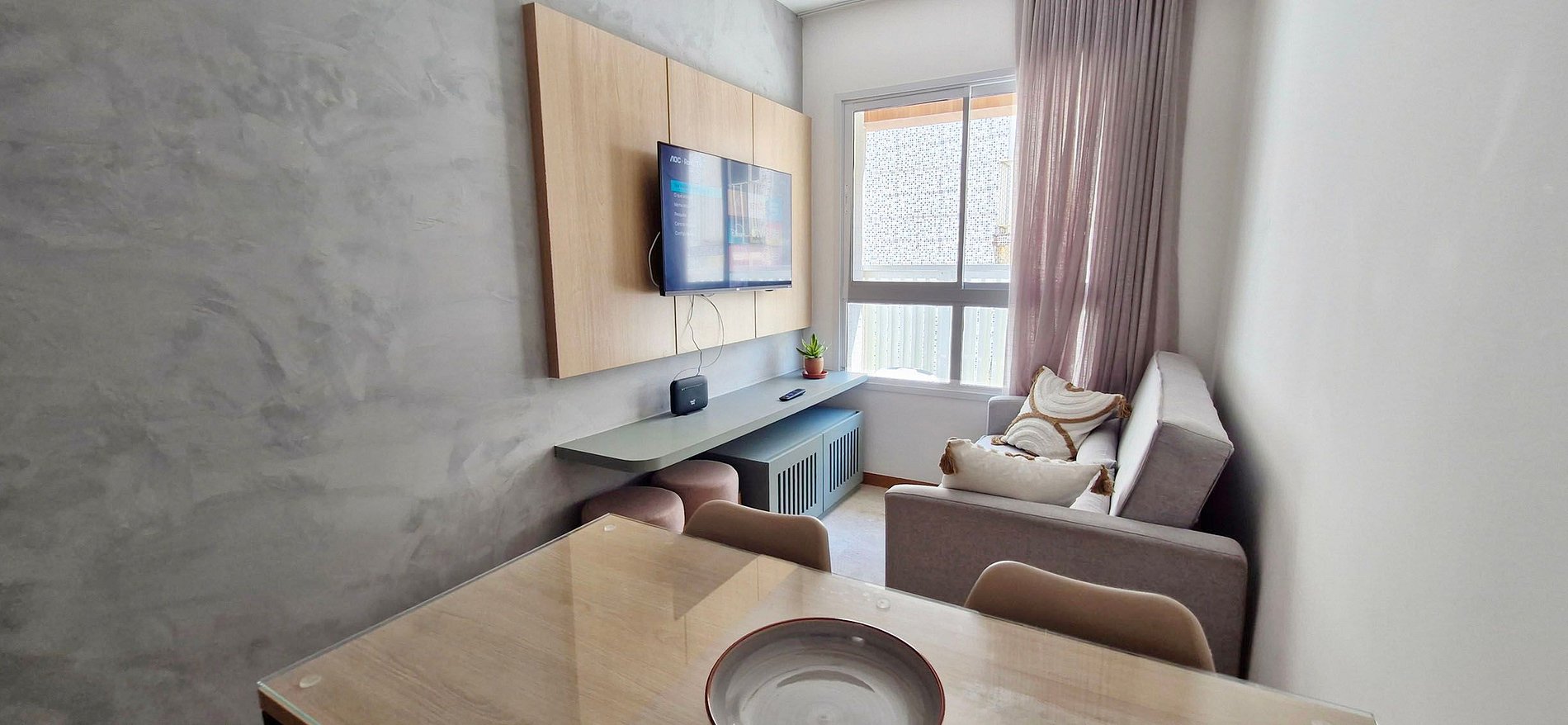 - Sofá, painel com smart TV, rack, cortina fina e 2 bancos redondos
