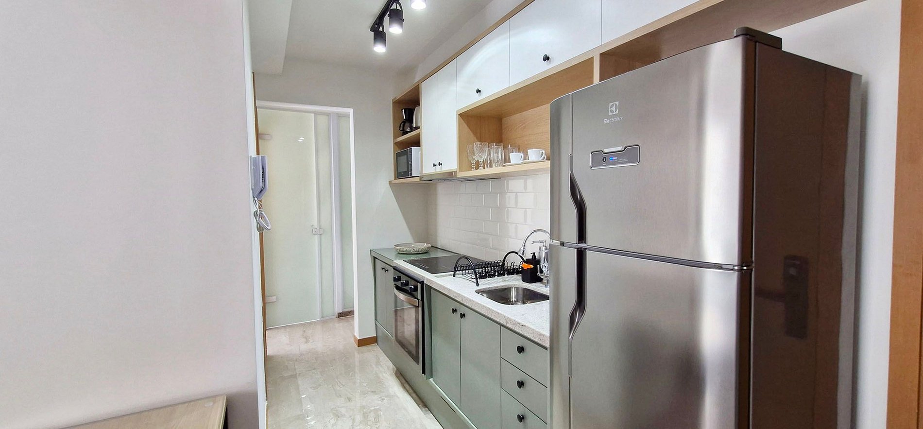 - Bancada com 2 cadeiras, geladeira duplex, forno elétrico, cooktop de indução com 4 bocas, depurador de ar, filtro de água, microondas, sanduicheira, liquidificador, cafeteria elétrica, chaleira elétrica, panelas, talheres, pratos e itens básicos de cozinha.