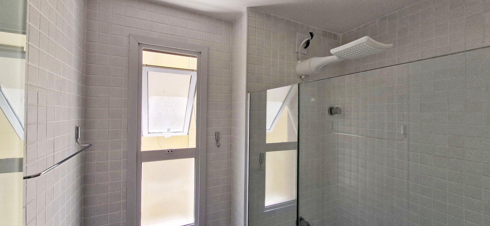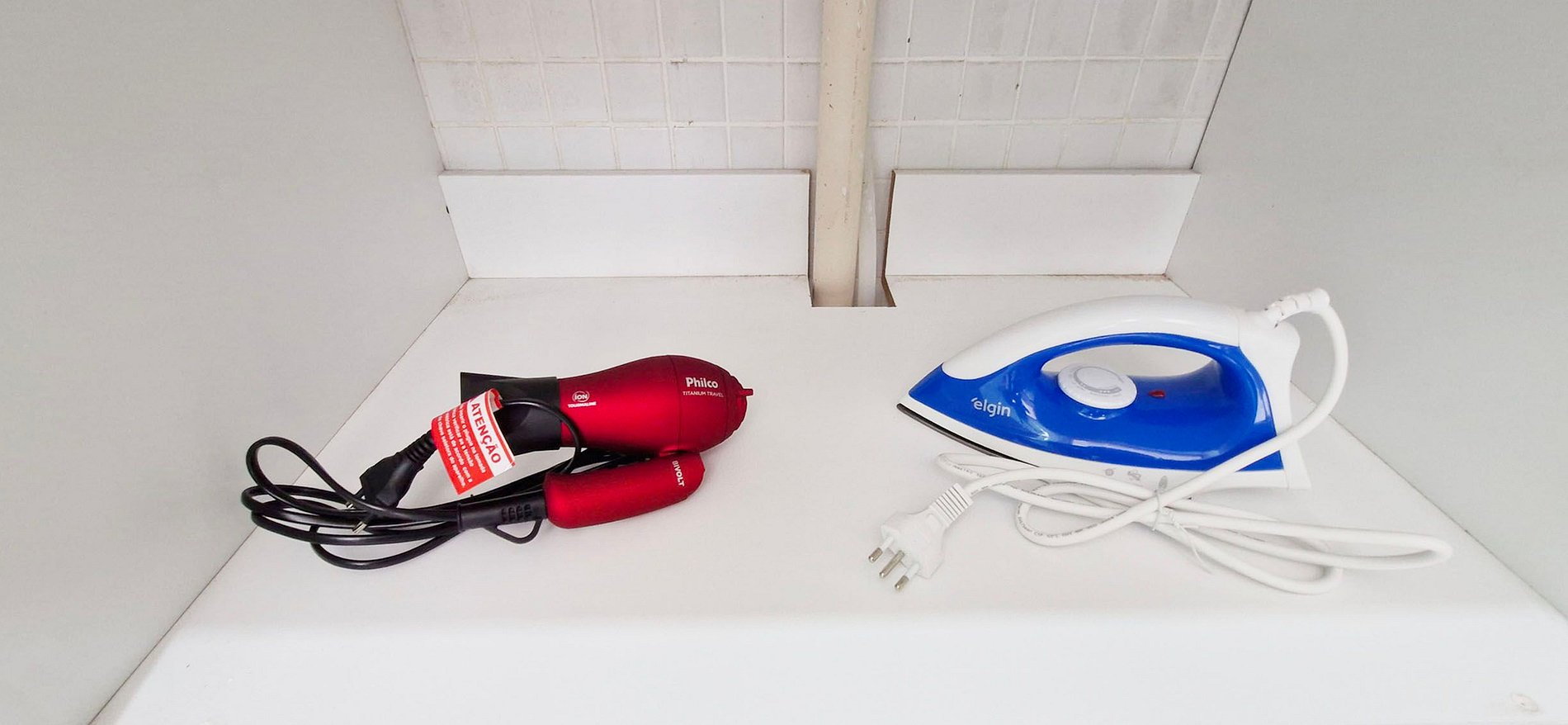 Chuveiro elétrico, box de vidro, ducha higiênica, pia com espelho e armário, ferro de passar, secador de cabelo